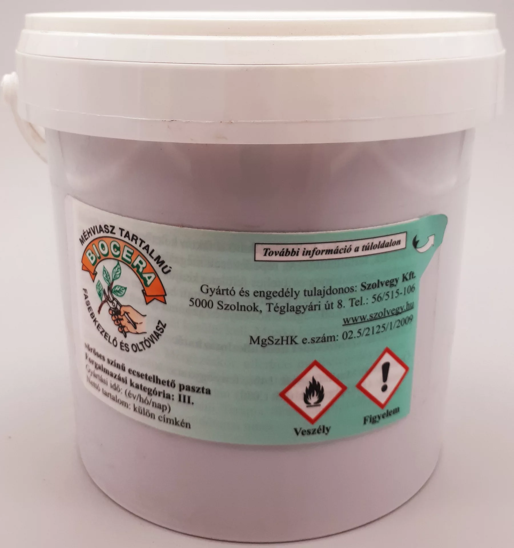Domeniul de aplicare: BIOCERA poate fi utilizat la pomi fructiferi, viță de vie, pomi ornamentali, etc. mai ales la tăiere, rupere de ramuri, tăierea ramurilor mai mari, daune de ceață sau furtună, sau în cazul rănilor apărute în alte moduri, pentru închiderea, dezinfectarea, protejarea suprafeței deteriorată a acestora până la cicatrizare. Produsul trebuie să fie aplicat într-un strat subțire imediat după tăierea sau altoirea copacilor pe rănile rezultate. În cazul fracturilor, fisurilor sau daunelor cauzate de animale sălbatice suprafața rănită a plantei trebuie să fie tăiat înapoi până la partea sănătoasă și trebuie să fie închis imediat. Agentul de tratare a rănilor copacilor și ceara de inoculare BIOCERA are ingrediente naturale, penetrează imediat după ungerea copacului la 1-2 mm adâncime, și distruge fungicidele și bacteriile deja conținute sau apărute datorită tăieturii în țesuturile acestuia. Impactul agentului de tratare a rănilor copacilor se bazează pe efectul dezinfectant imediat a alcoolului si efectul dezinfectant de durată a cearei de albine si rășina de conifere. Ceilalți aditivi asigură flexibilitatea și durabilitatea învelișului. Stratul format în timpul solidificării protejează rănile și împotriva infecțiilor ulterioare și scăparea sevelor, precum și împotriva generării mugurilor lângă suprafața tratată. BIOCERA vindecă rana și în acelaș timp și închide, să ofere o protecție de lungă durată. Din cauza diversitatii plantelor, în cazul plantelor non-native pe teritoriul Ungariei, arbori exotici, arbuști și plante ornamentale se poate utiliza numai pe baza de pre-proces. Trebuie sa fiți atenți în mod special la altoire, mai ales în cazul în care pielea nu este suficient de matur sau datorită proprietăților plantelor nu este suficient lemnos (prin urmare, nu poate fi utilizat, de exemplu: la citrice) BIOCERA datorită consistenței excelente este ușor de aplicat cu pensula rigidă, spatulă sau o creangă tăiată plat. Un avantaj deosebit este faptul că acesta nu este sensibil la îngheț, se poate bine folosi și la -10 ° C. Poate fi diluat și șters de pe unealtă cu alcool denaturat. CONȚINUT SUBSTANȚĂ TOXICĂ: Non-toxic, pentru pești, albine nu este periculos. Timp de așteptare pentru alimente și sănătate: 0 zi. Pericol de incendiu clasa II. DEPOZITARE: stocat în loc protejat de căldură radiantă și de soare. Depozitare: 2 ani. Altele: strict interzis deversarea resturilor de materiale neutilizate în râuri, cursuri de apă, iazuri, lacuri. Echipament de protecție recomandat: mănuși de cauciuc