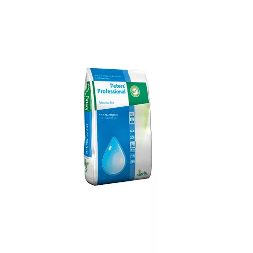 Fertilizant lichid pentru irigare Peters Professional 17-07-27 (Poinsettia Mix) a fost dezvoltat special pentru cultivarea crăciuniței, satisfăcând pe deplin cerințele nutriționale specifice acestei specii. Peters Professional 17+07+27 (Poinsettia Mix) conține în proporții variabile bor, zinc și molibden, permițând obținerea unor plante ornamentale sănătoase și de calitate superioară. Conține o cantitate mare de azot nitrat.