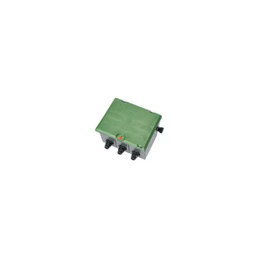 Pentru 3 ventile electromagnetice cu 9V sau 24V. Conexiune variabilă din trei laturi. Cu șurubul de fixare telescopică supapa este ușor de montat și detașabil din cutie. Capac de deshidratare central pentru desecarea părții de intrare în perioada geroasă. Capacul se poate închide în condiții de siguranță pentru copii. Filet exterior 1’. Benzi din carton colorat.