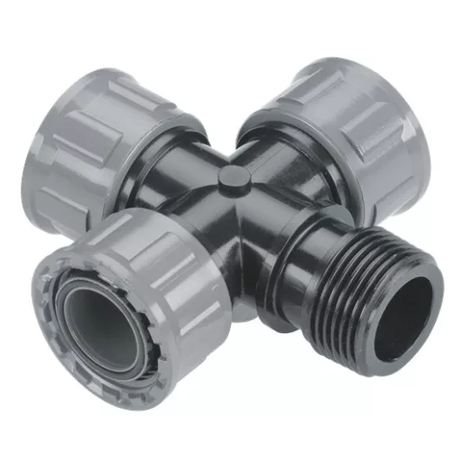 Supapă de conexiune cu economie de spațiu. Conexiune cu șurub simplu. 3 x 1 filet interior, 1 x 1 "filet exterior.
