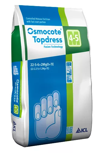 Durata de efect: 4-5 luni Compoziție: 22 + 5 + 6 + 2,0 MgO + microelemente Doza recomandată: 2-4 grame / litru (oală volum) După iernare, plantele containerizate mai mari nu pot fi întotdeauna transplantate pentru a obține substanțe nutritive proaspete. Este nevoie de o soluție de fertirigare, dar trebuie hrănire și echipamente de udare precisă pentru că și vremea împiedică adesea fertirigare continuă. Osmocote Topdress este un adaos superior pentru înverzirea rapidă de primăvară, potrivit pentru eliminarea rapidă a simptomelor de deficiență a nutrienților. Special dezvoltat pentru producția de pepinieră containerizate, îngrășământ pavat pentru tratarea de vârf a plantelor de container. Eefectul optim exercită atunci când udarea se face din partea de sus și substanțele nutritive extractibile ajung la rădăcină în mod regulat. Produsul conține promotori de adeziune ecologice, care promovează o mai bună aderență a îngrășământului pe suprafața mediului, astfel încât la turnarea containerului nu se împrăștie.