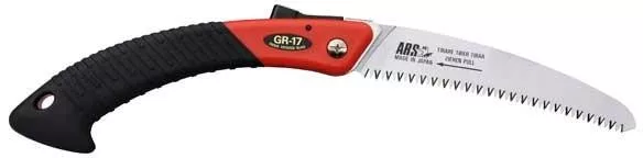 Ferăstrău de pliere universală cu mecanism de blocare a siguranței, cu mâner de cauciuc. La capătul mânerului există o inserție din oțel, partea portantă a dispozitivului de blocare este, de asemenea, realizată din oțel.