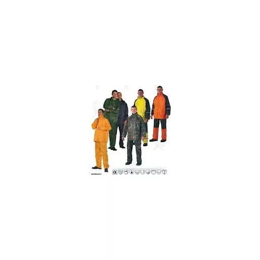 Jachetă+pantaloni. Material: poliamidă imersat în PVC moale, cu grosime de 0,18 mm, cusut și sudat, cu orificiu de aerisire impermeabilă pe spate, glugă ascunsă în guler, material subțire, rezistent la rupere, la apă și la vânt, rezistență la frig: -20 °C, manșetă cu elastic, partea gleznei cu capse, două buzunare exterioare.