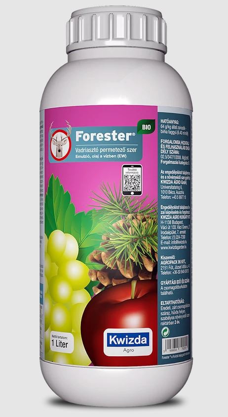 Soluție de stropit împotriva animalelor sălbatice, în format lichid, emulsie. Este un preparat care se poate aplica în silvicultură, pepiniere precum și în culturi de câmp pentru a ține departe căprioarele și cerbii care provoacă pagube mari. Tehnologie recomandată: UTILIZARE ȘI DOZĂ: în silvicultură, în culturi foioase, la conifere, produsul se aplică în forma originală, fără diluare. La plantații tineri, distribuirea precisă asigură creșterea fără probleme și păstrează valorile biologice ale copacilor. Produsul trebuie distribuit uniform prin picurare pe suprafața pe care o vrem să protejăm, toamnă târziu sau la începutul iernii, în zilele când nu îngheață, sau în perioada de distribuire de primăvară-vară. Doza aplicată (10-20 litru/ha) depinde de cultură și de stadiul de dezvoltare al plantelor (de ex. nuia cu muguri, vlăstari cu frunze). În cele doua perioade de distriburie, se recomandă aplicarea a câte un tratament. În cazul pomilor de măr, tratamentul trebuie aplicat la începutul primăverii (la înmugurire), în doză de 20l/ha, produsul trebuie distribuit fără diluare, sau, pentru a asigura o acoperire mai bună, se poate dilua cu apă în proporții de 1:3 sau 1:5, înainte ca frunzele să apară. La vie, produsul se poate distribuie în doză de 10-15 l/ha, de la stadiul de răsărire cu trei frunze la începutul înfloririi, diluând cu apă în proporții de 1:3-1:5. Dacă stadiul de dezvoltare al viei permite, se poate repeta stropirea la 28-42 zile după tratament, dacă se observă din nou daune. La culturi de câmp (mălai, rapiță, floare soarelui, soia), produsul se distribuie în doză de 15l/ha, de la faza de 3-4 frunze. Tratamentele ale marginilor cu acest produs (cel puțin într-o lățime de 20 m) în cazul tablelor mari, poate fi o soluție economică pentru a reduce daunele cauzate de marile animale sălbatice. În acest caz, doza de 15l/ha se calculează pe unităte de suprafață. Combinații recomandate, amestecuri. Atenție! Forester(R) EW nu se poate amesteca cu alte produse de protecție a plantelor, se distribuie doar ca atare. Notă. Recomandări practice. Preparatul se distribuie prin stropire, fără diluare, pe suprafața pe care dorim să protejăm (se adaptează după faza fenologică a culturilor). Pentru a asigura durata de acțiune, soluția trebuie să se usuce, de aceea, tratamentul este recomandat în primul rând pe timp uscat. MECANISMUL DE ACȚIUNE: Forester(R) EW soluție de stropit împotriva animalelor sălbatice, este un preparat care poate fi aplicat pentru o protecție împotriva căprioarelor, cerbilor și muflonilor, în culturi silvice și pomicole. Substanța activă, grăsime din origine animală, a fost dezvoltată pe baza de observații în natura, iar cu folosirea acesteia, culturile silvice și pomicole se pot proteja de marile animale sălbatice. Preparatul declanșează efectul de alarmă printr-un miros care este neplăcut pentru animale. După tratamentul suprafeței pe care dorim s-o protejăm, pentru a asigura durata de acțiune, soluția trebuie să se usuce, de aceea tratamentul este recomandat pe timp uscat. Pe timp cețos, ploios, tratamentul nu se poate efectua, deoarece nu este posibilitate formării unui strat uscat care protejează planta. Nu se recomandă aplicarea altor soluții, nici înainte cu o săptămână de tratament, nici timp de o săptămână de la răsărire, pentru a nu scade efectul. În zile călduroase se poate distribui doar în orele dimineții sau serii. A nu se aplica sub temperatura punctului de îngheț. După terminarea lucrului, aparatul de stropit se spală foarte bine!