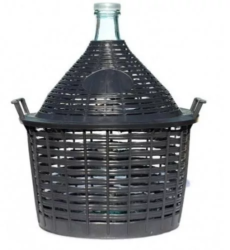 Damigeană din sticlă cu gură largă, cu înveliş detaşabil din plastic.