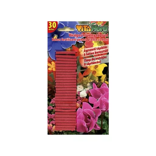 VitaFlora baton de îngrășământ pentru plante de cameră și de balcoane cu flori. Aprivizionează planta cu compoziție adecvată de nutrienți conform nevoilor acesteia timp de 8 săptămâni. Soluție convenabilă pentru fiecare plantă de cameră udată, plante cățărătoare, plante verzi agățate, palmieri, ferigi. Eliberarea constantă de nutrienți oferă frunze sănătoase de culoare verde și înflorire bogată. Aplicaţie: Pentru toate tipurile de plante de cameră și de balcoane cu flori sau pentru plante anuale ;Begonia, Gălbenele, Ardei ornamentale, Flamingo, Capul violet, Fucsia, Gerbera, Gloxinia, Bluebells, Kalla, Exacum Affine, klívia, Floare de poveste, Muscata, Impatiens, Pachystachys lutea, Flori papuci, Floare vrajba superbă, Ciuboțica cucului, Flori de mătase de culoare mov, Flori de gură, Aeschynanthus, Crinul de cameră, Floare de ceară, Spathiphyllum,etc. Dozare: Așezați batonul de îngrășământ la 1-2 cm de la marginea ghiveciului sau lăzii de flori într-o gaură si acoperiți cu sol. În vase mai mari, dacă este nevoie de mai multe batoane acestea se asează lângă perete unul lângă altul uniform în sol. Alimentarea cu nutrienți se repetă bilunar, iar în perioada de somnolență nutrienți se reduc la jumătate. Nu utilizați batoanele de nutrienți la culturile care se iernează la temperatură rece. Udați plantele în mod obișnuit. Batoanele se pot folosi la udare superioară și inferioară a plantelor, livrarea de nutrienți poate fi afectat de volumul și temperatura apei. Sfaturi de aplicare: Batoanele de îngrășământ nu înlocuiesc oligoelementele. Este recomandat să se întrerupă periodic nutrierea cu batoane și planta sa fie udat timp de mai multe săptămâni cu soluția de nutriere VITAFLOR. Nu se aplică deodata batoane și lichidul de nutriere, deoarece aceasta poate provoca supradozaj!