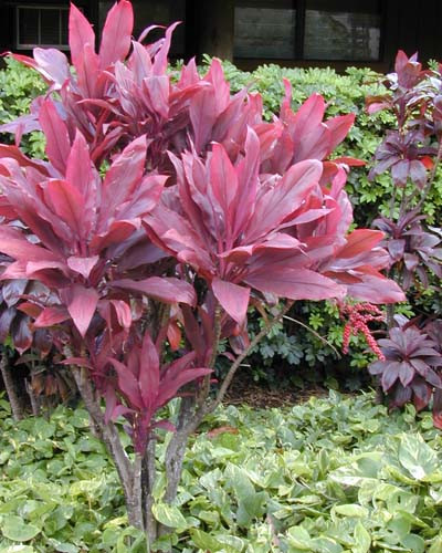 Acesta este un soi foarte popular de Cordyline. Creşterea este puţin mai lentă decât la soiuri verzi. Este un arbore sempervirescent, uşor ramificat, al căror frunze sunt de culoare bordo intens, erecte, au lungime de 1-1,5 m şi sunt viguroase. Florile mici şi parfumate se deschid vara în buchet mare. Această specie Cordyline preferă clima tropicală, umedă, de aceea trebuie să fie ţinută în locuri asemănătoare, dacă dorim să ne bucurăm timp de mulţi ani de înfăţişarea ei deosebită. Deoarece acest soi are origine subtropicală, iarna trebuie ţinut la o temperatură de peste 12°C. Cordyline nu are cerinţe mari în ceea ce priveşte irigarea, balotul de pământ însă nu trebuie lasat să se deshidrateze. Este benefic dacă apa de irigare nu este rece, ci călduţă, deoarece în caz contrar frunzele pot cădea sau se pot înnegri. Pentru o dezvoltare bună este necesar un sol bogat în substanţe nutritive, cu bună gestionare a apei. Exemplarele în ghivece se irigă cu moderaţie, iar iarna şi mai puţin. Necesită multă lumină, dar rezistă şi la semiumbră. Acarianul roşu comun le poate cauza daune. Temperatură minimă: 12°C. Este sensibil la îngheţ. Perioada de germinare a seminţei: 2-3 săptămâni.