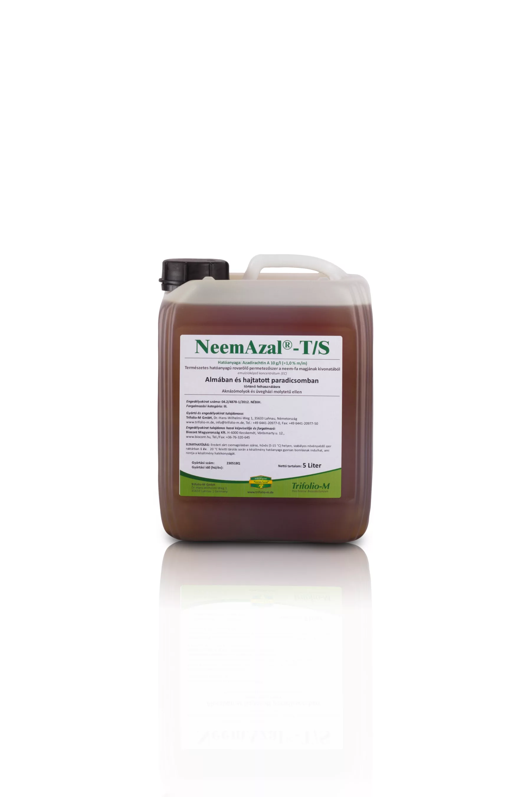 Neem Azal® T/S este un insecticid biologic cu un mecanism de acțiune complex, utilizabil atât împotriva dăunătorilor cu aparate bucale sugătoare, masticatoare, cât și a celor galericulari. Pătrunde în organismul dăunătorilor prin hrănire (mestecare sau supt), unde își exercită efectul prin blocarea hrănirii, inhibarea sintezei chitinei și inhibarea reproducerii. Datorită mecanismului său de acțiune complex și diferit față de insecticidele convenționale, are excelente proprietăți de rupere a rezistenței, astfel putând fi integrat în programele convenționale de protecție. Este un produs cu efect profund, care se poate absorbi în lamela foliară și astfel poate acționa și împotriva dăunătorilor cu mod de viață ascuns și greu de controlat, cum sunt moliile galericulare. Populațiile de păianjeni suctori de pe fețele inferioare ale frunzelor, responsabile și de transmiterea mai multor boli virale, pot fi controlate cu succes cu acest produs. Are persistenta scăzută în mediu.