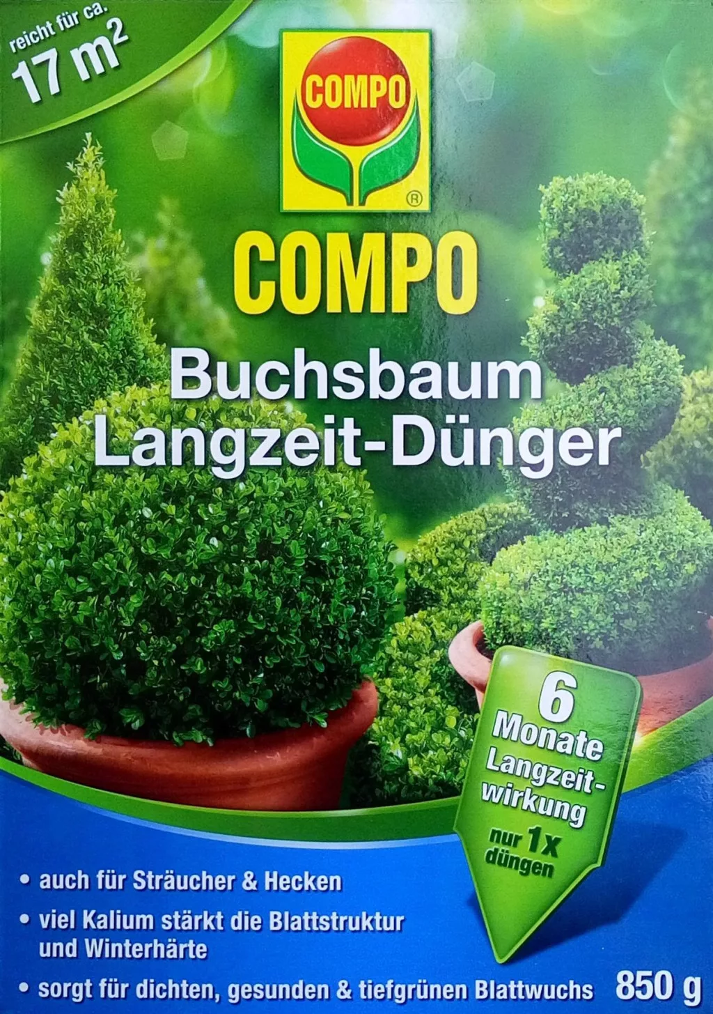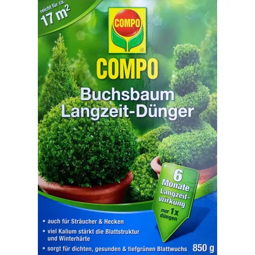 Fertilizare inovatoare cu dozare controlată a nutriției - fertilizarea unică oferă cimișirului toate principalele substanțe și substanțe nutritive importante - efect imediat și de lungă durată timp de 6 luni - o compoziție de specialitate pentru nevoile de arbust și cimișir - Conținutul ridicat de azot și potasiu asigură o creștere puternică, frunze dense și de culoare vie. Ek-fertilizator, Îngrășământ NKP, parțial îmbrăcat cu magneziu 16-6-14 (+2) – săracă în clorură Aplicare: cimișiri, garduri vii, lemn-câinesc, carpen, fag, arbore de gălbenele Fertilizatorul trebuie distribuit și prelucrat temeinic în sol, poate fi utilizat din martie până în iulie. La plantarea plantelor în aer liber, se amestecă max. 40 g cu 20 l de pământ. În primăvară, 40-80g pe plantă, 40g / m2 la garduri vii