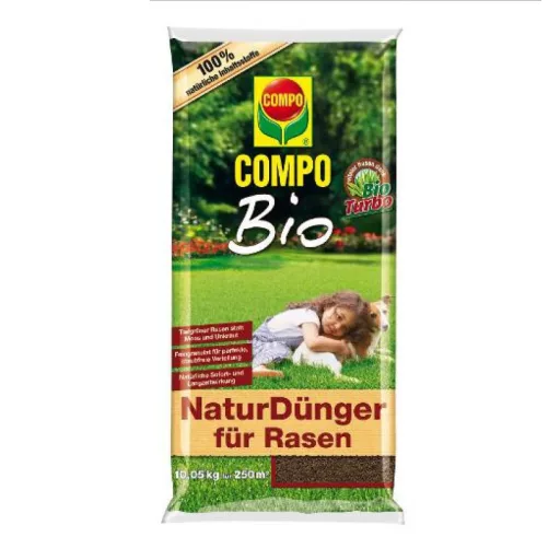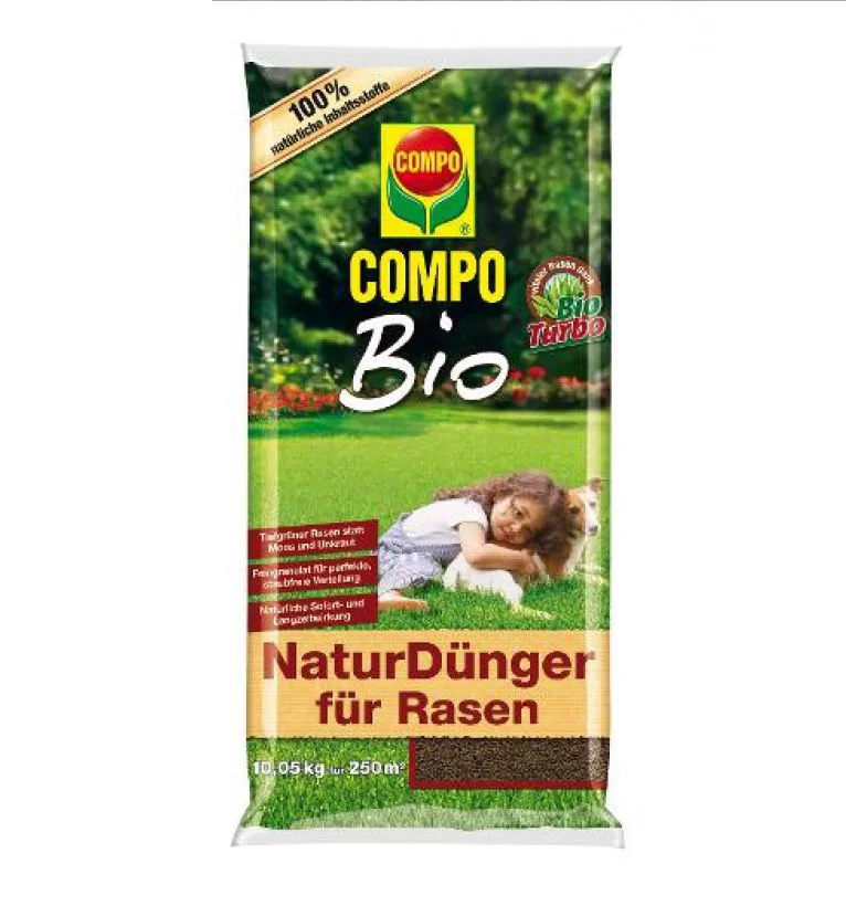 Îngrășământ organic NPK 10 + 3 + 3 Gazon mai verde în loc de mușchi și buruieni. • Distribuție ideală și fără praf, granule granulate pentru utilizare într-un distribuitor de îngrășământ. • Efect natural instantaneu și de lungă durată. 10,05 kg = 250 m2 Vă recomandăm să fertilizați gazonul în sezonul de gazon de 4 ori. Îngrășămintele suplimentare pot ajuta gazonul pentru a depăși simptomele stresului și uzurii după condiții meteorologice extrem de nefavorabile (de exemplu, ploaie și secetă prelungită). Ar trebui fertilizat gazonul cel puțin o dată la 6 săptămâni. Fertilizarea ar trebui să fie întotdeauna urmată de udarea consistentă. Fertilizarea inițială: martie / aprilie Fertilizarea sezonieră 1: mijlocul / sfârșitul lunii mai Fertilizarea sezonieră 2: începutul / mijlocul lunii iulie Fertilizarea de toamnă: septembrie / octombrie 100% îngrășământ natural de gazon cu înaltă calitate, granule fine. Fiecare granulă conține toți nutrienții, ușor împrăștiată, pătrunde adânc în iarbă. Timp de câteva saptamâni, acesta furnizează ușor hrană pentru gazon, în timp ce BioTurbo stimulează activitatea la sol. Este potrivit pentru dezvoltarea gazonului, nou gazon plantat și fertilizarea covoarelor de gazon.
