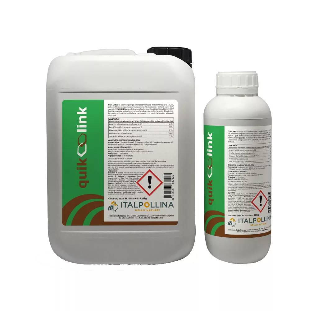 QUIKLINK este un îngrășământ organic special, bogat în aminoacizi și peptide, și conține oligoelemente adăugate (cupru, fier, molibden, mangan și zinc). Componenții biologic activi (oligoelemente, aminoacizi și peptide) stimulează creșterea rădăcinilor și întărirea, îngroșarea țesuturilor radiculare (lignificare). Molibdenul din compoziție este esențial pentru dezvoltarea părților vegetative ale plantei. Crește metabolismul, ajutând astfel la combaterea stresurilor de mediu și a agenților patogeni. Funcționează foarte bine împreună cu ciupercile micorize. Poate fi utilizat prin irigare prin picurare și ca fertilizare foliară.
