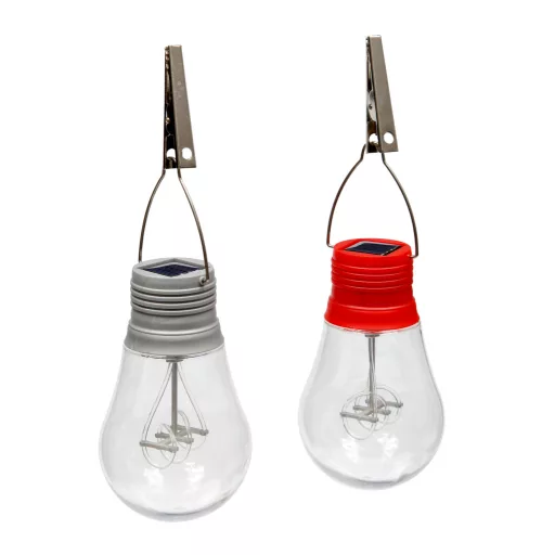 Lampă cu pandantiv solar din plastic. Acestea au formă de bec, excelente pentru decorarea grădinii și a terasei, creând o atmosferă festivă. LED-urile în formă de spirală conferă un aspect vechi și estetic. Include 1.2V 2/3 AAA mAh Ni-Mh baterie reîncărcabilă.