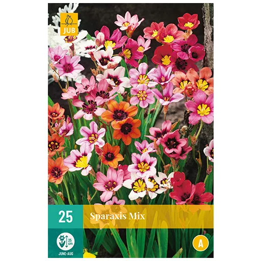 Sparaxis este un amestec de flori viu colorate, cu inima galbenă. Floarea este în formă de pâlnie, iar frunzele sunt lanceolate. Înălțime 25 cm. Sparaxis este o floare cu o formă lanceolată și o floare cărnoasă cu un capitul de 25 cm. Poate fi plantată în borduri și ghivece. Este, de asemenea, o floare tăiată profitabilă. Bulbii trebuie să fie scoși din pământ înainte de primul îngheț.
