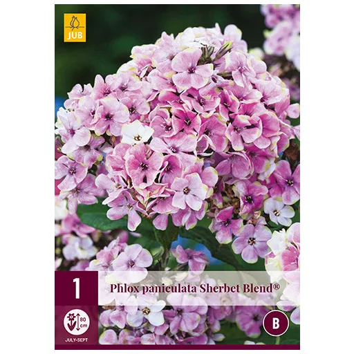 A Phlox paniculata Sherbet Blend este o selecție frumoasă pentru grădină, cu flori roz și verzi. Florile se răsucesc în boboc, fiind împărțite în cinci petale și având o deschizătură în centru. Florile emană un parfum fin și sunt atrăgătoare pentru fluturi. Numele maghiar al phloxului este lángvirág.