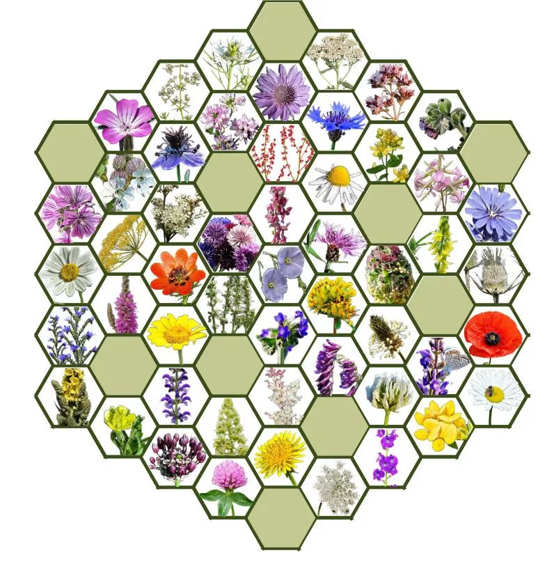albăstrele (amestec de culori și sălbatic), sânger, păianjen cu flori stufoase/pătațirfarkcrown, amestec de elecampane, nalbă de pădure, in peren, testicul alb, dulceață de pajiște albă, pițigoi de pajiște vopsitr, héjakút mácsonya, hólyagos habszegfű, kamilla, kapor, keleti szarkaláb, kígyóhagyma, koloncos legyezőfű, konkoly, kömormoloc comun, iarba limbii comune, galah comun, sunătoare comună, sunătoare comunăsalvie, salvie ungurească, panseluță de câmp, panseluță de câmp, gălbenele de câmp, tufă de buburuză de câmp, larkspur de câmp, câmpb, salvie de câmp, sorrel de vară, picior de iepure, atracl medical, somsomcora medical, soapwort medical, Austriansalvie, mac parlagian, mac, păpădie, imola de pajiște, fanwort de pajiște, gălbenele de pajiște, gălbenele de pajiște, bugle de cerb, foxglove de pajiște, pajișteiarbă de mlaștină, festucă de pajiște, răchită pătată, șerpișoară albăstruie, iarbă de pajiște sălbatică, roiniță sălbatică, ranuncul de semănat/de pajiște, testicul roșu