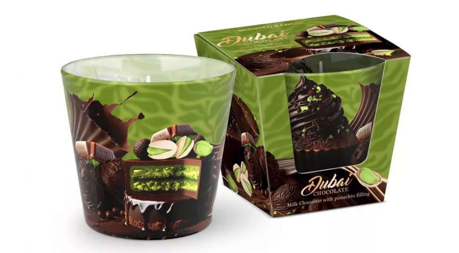 Lumânare parfumată Dubai Chocolate - O combinație luxoasă de ciocolată și fistic