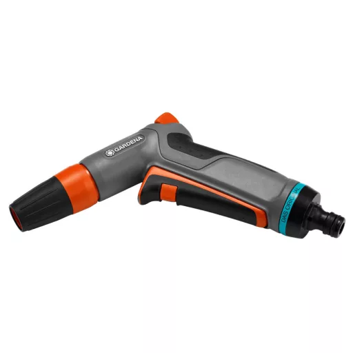 Pistolul de curățare GARDENA Comfort poate fi folosit atât pentru curățare, cât și pentru udare. Capul are elemente din plastic moale care oferă protecție împotriva vătămărilor. La udare continuă, declanșatorul de impuls poate fi setat în regim de funcționare continuă, ceea ce protejează mâna.