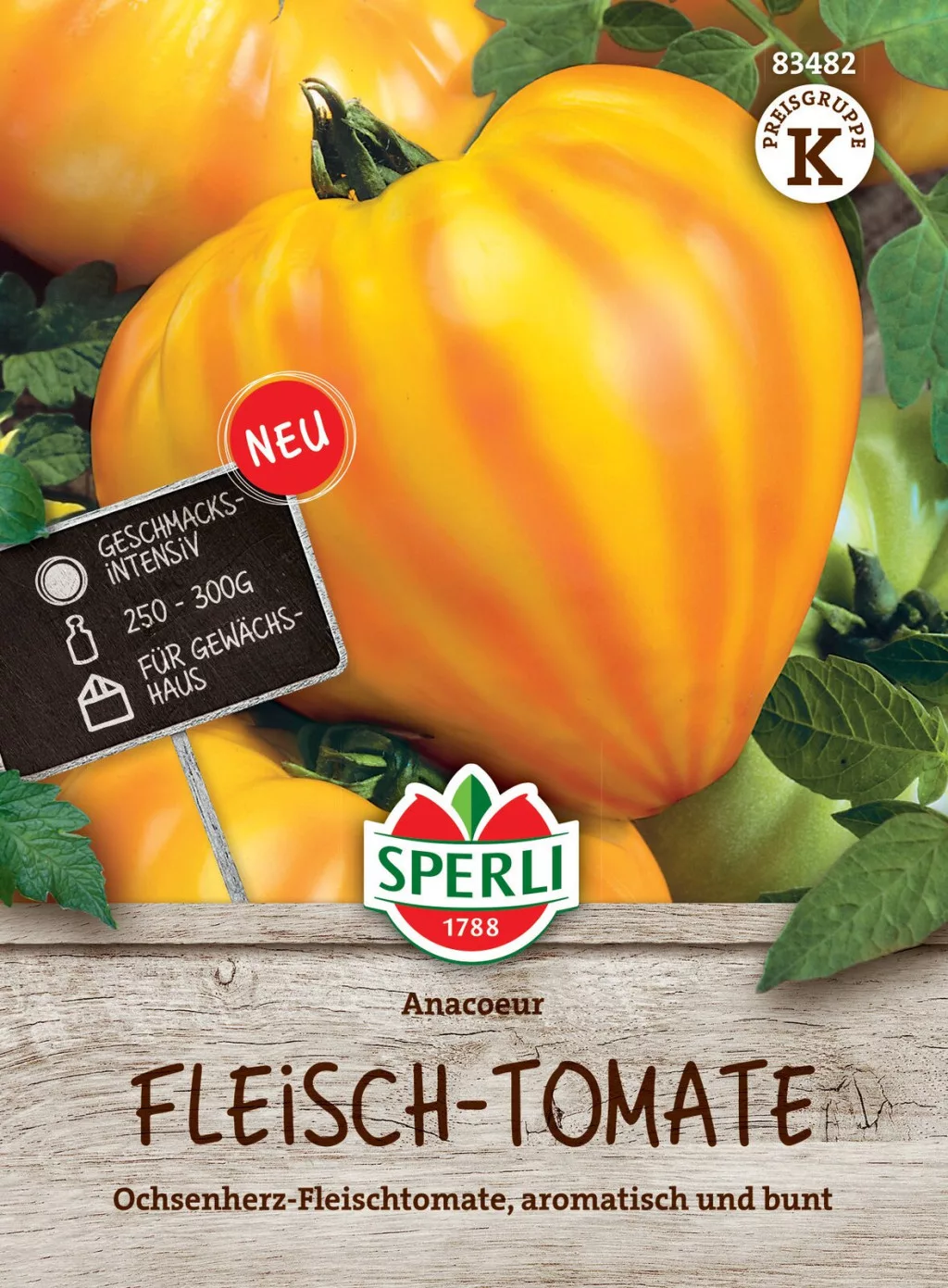 Acest tomate tip inimă de bou este o adevărată experiență vizuală, cu o apariție și un gust excepționale. Produce fructe în formă de inimă, de 250–300 g, cu o aromă fantastică. Pulpa este fermă, suculentă, parfumată și prezintă o tranziție de culoare de la galben la roșu. Pe măsură ce nuanța portocaliu/galben devine mai intensă, se poate începe recoltarea. Anacoeur este un cartof tomatelor potrivit atât pentru cultură în câmp deschis, cât și în sere. Asigurați un sistem de susținere și îndepărtați regulat lăstarii laterali. Nu plantați înainte de mijlocul lunii mai. Este un tufă de tomate cu creștere viguroasă, de aceea necesită fertilizare și udare bogate, precum și un loc însorit și ferit.