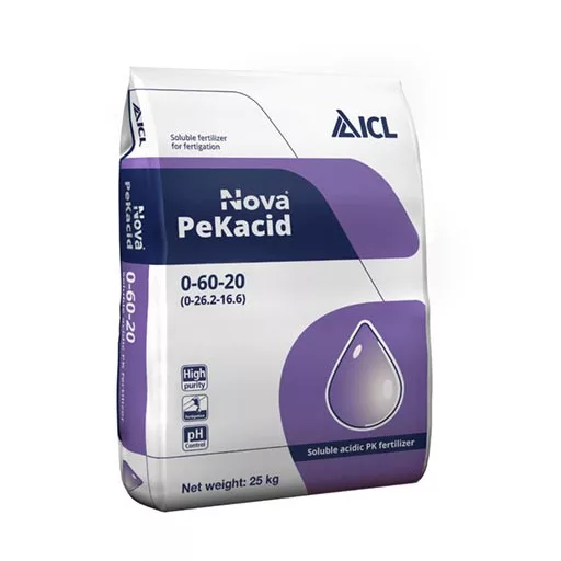 PeKacid are un caracter puternic acid (pH = 2,2), conține fosfor (P) și potasiu (K) perfect solubile în apă, având compoziția NPK 0-60-20 (60% P2O5 și 20% K2O) pentru fertilizare prin irigare.