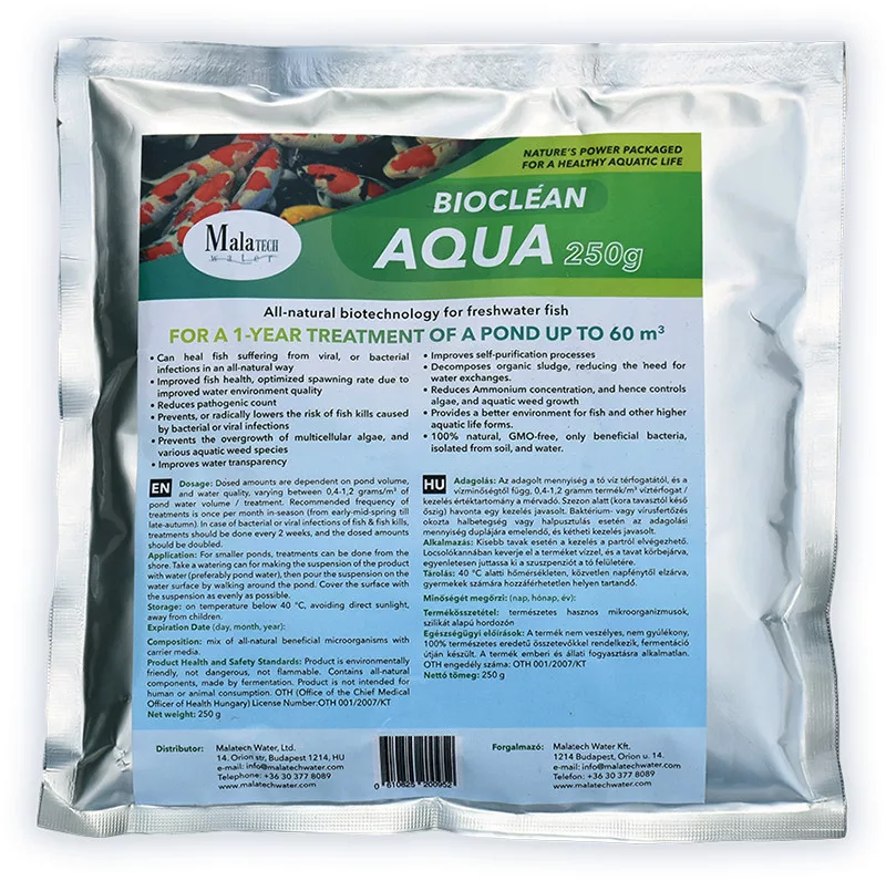 Cantitatea dozatǎ depinde de volumul de apă al iazului și de calitatea apei; pentru tratamente de întreținere/preventive este relevant intervalul 0,1–0,2 grame produs / m3 volum de apă / tratament. În sezon (din primăvară până toamnă) se recomandă 3–4 tratamente. În prezența infecției sau în caz de mortalitate a peștilor se recomandă 0,4–0,8 grame produs / m3 volum de apă / tratament; în acest caz tratamentul se repetă la două săptămâni până la dispariția problemei. Pentru consultanță profesională și privind dozarea sunați la +36 30 377 8089 sau scrieți-ne la info@malatechwater.com.