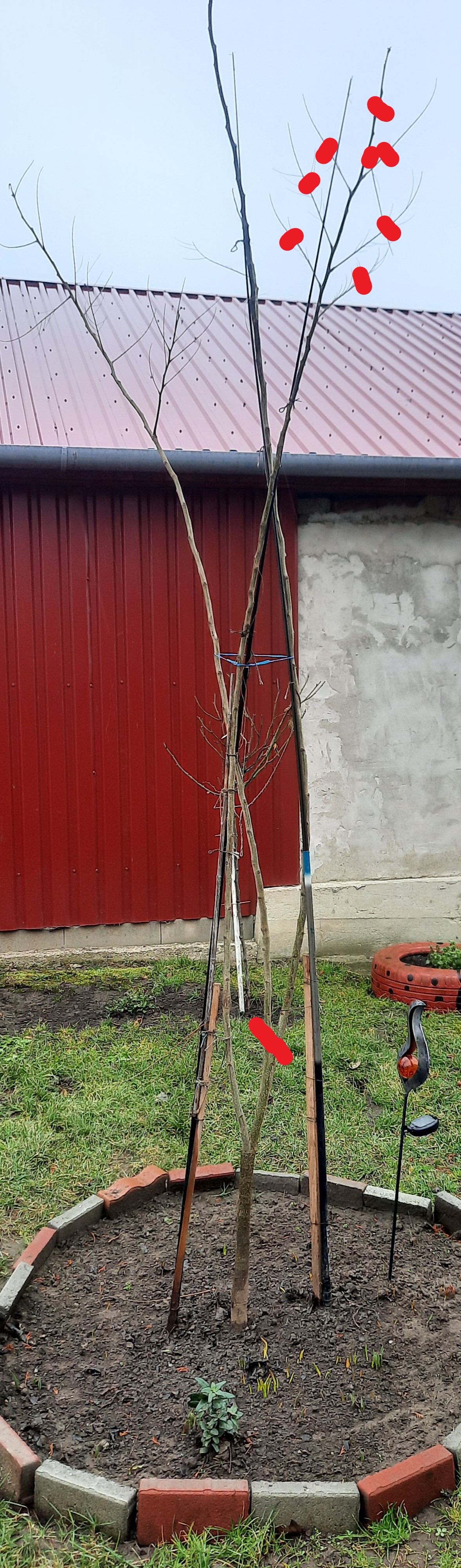 A 3 ágból meghagynám a viszonylag egyenesen növőt, a másik kettőt tőből eltávolítanám. Mivel viszonylag vastag ágak, a sebkezelés erősen ajánlott. A meghagyott ágat, amiből törzset nevel, hármas karózással - a jelenlegeninél erősebb, vastagabb karóval, nem pálcával - függőlegesen rögzíteném. A koronavesszőket kurtítanám. Berajzoltam az alábbi képen.