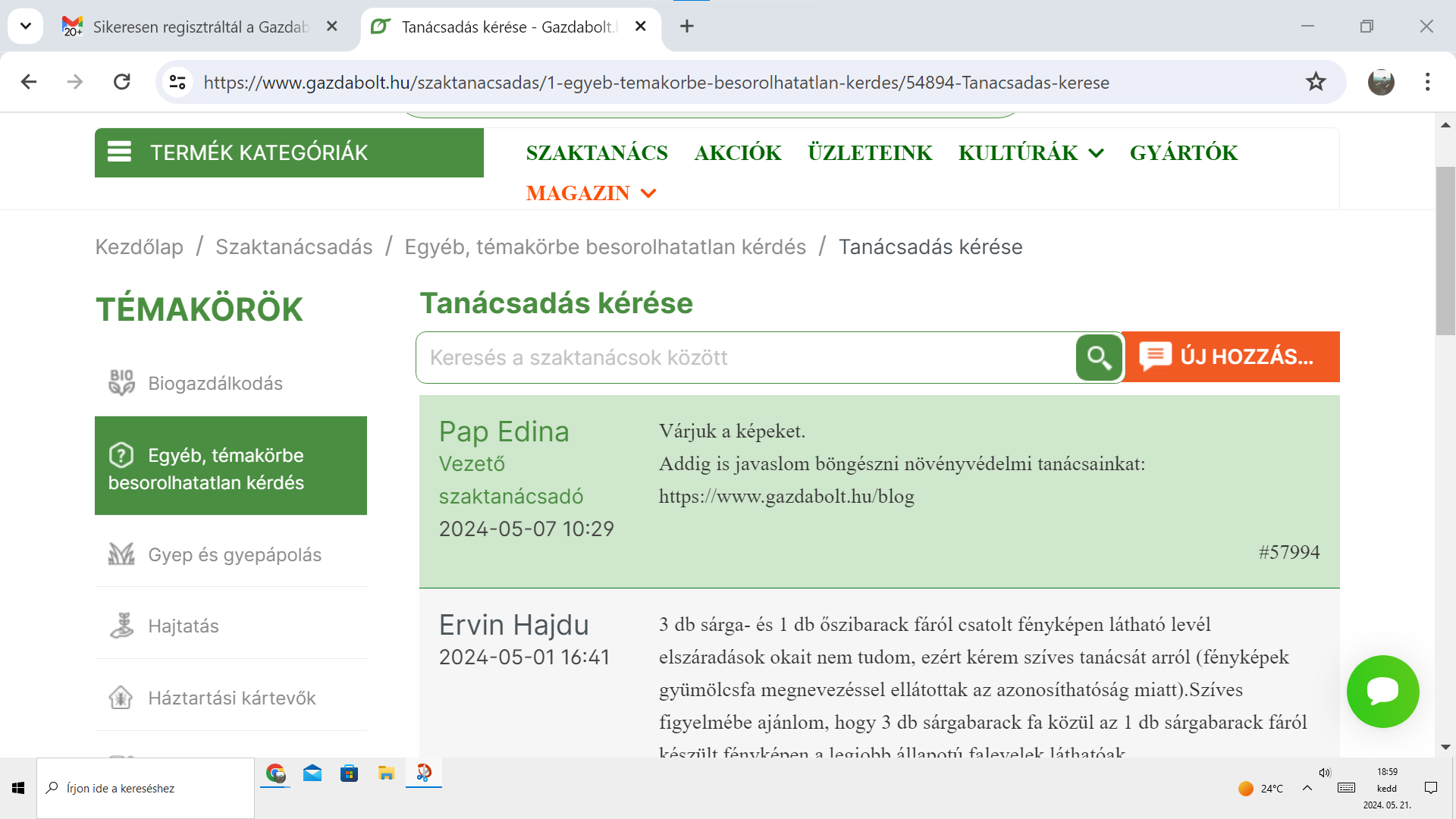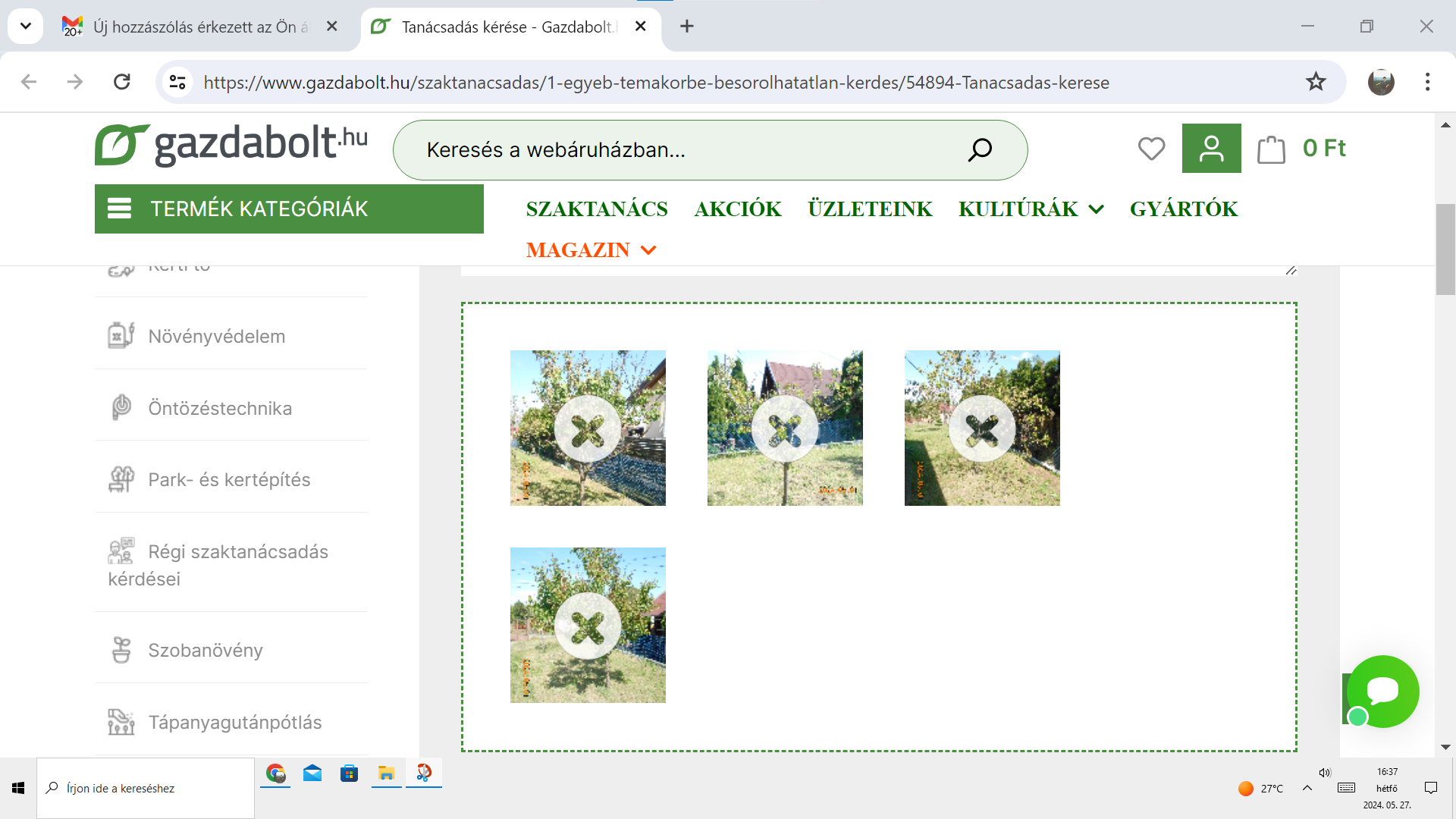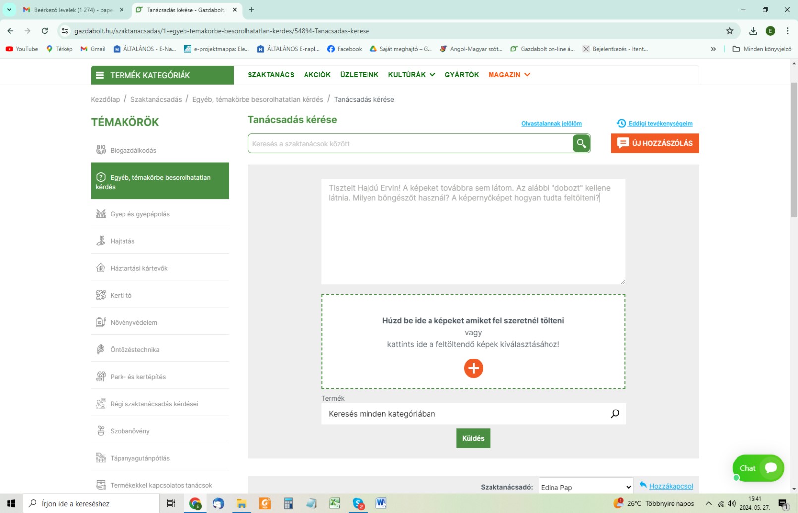 A weboldalukon regisztráltan és 2024.05.01-jén szaktanácsadást kértem Önöktől, amelyhez a szövegmező kitöltésekor nem tartozott fájl csatolási lehetőség, ezért a szövegben hivatkozott fényképeket nem csatolhattam. Utána kérte a hiányzó fényképeket, amelyeket 2024.05.07-én utólag csatoltam megküldtem, viszont választ a mai napig nem kaptam.