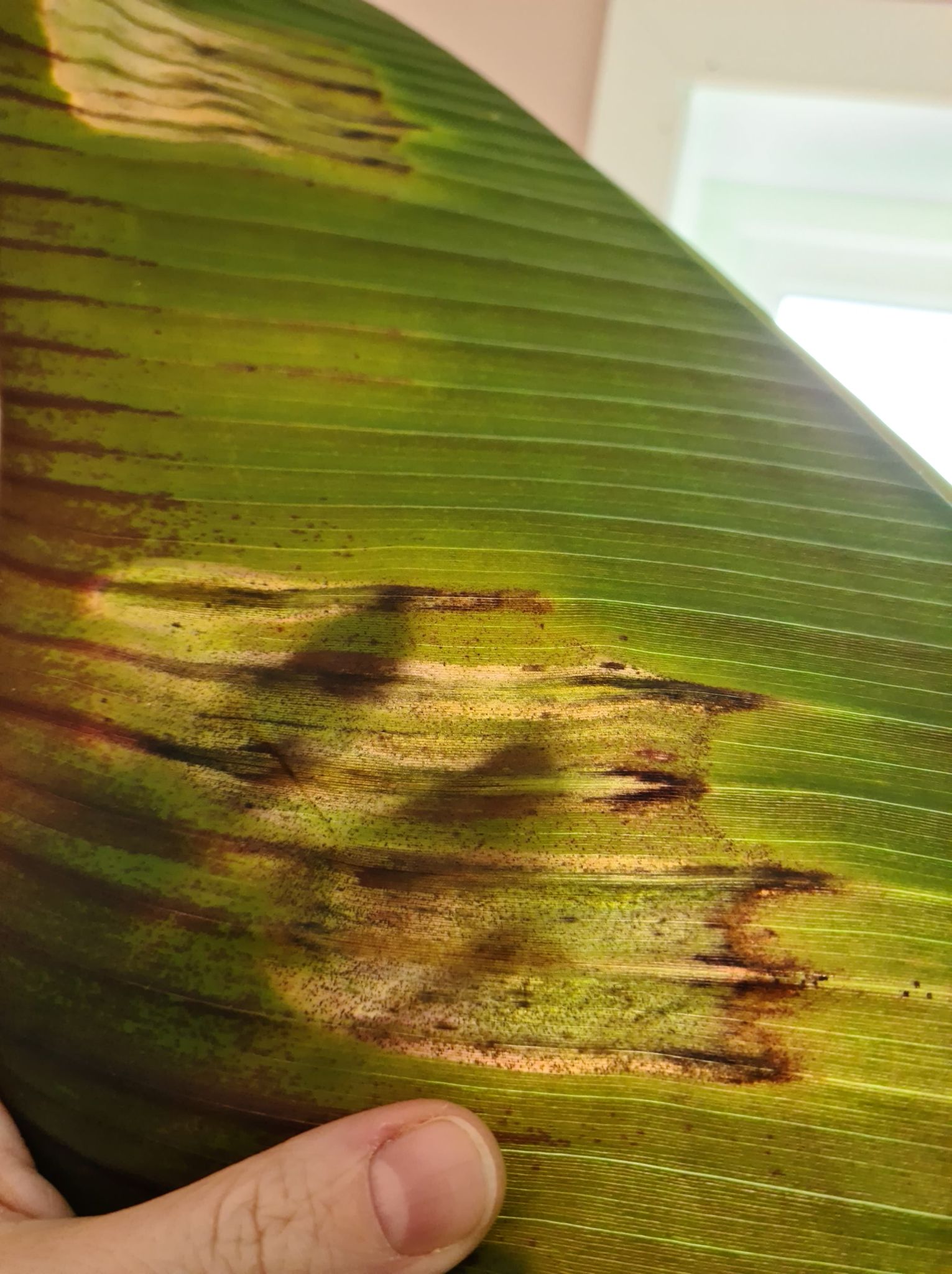 a képen látható problémára keresek megoldást. A vörös abesszín banán levelén jelentek meg nagy kiterjedésű sárgás, szinte átlátszó foltok, mintha a levél szerkezete elvékonyodna. Olyannyira, hogy látható az ujjam mögötte. Mi okozhatja az elváltozást?