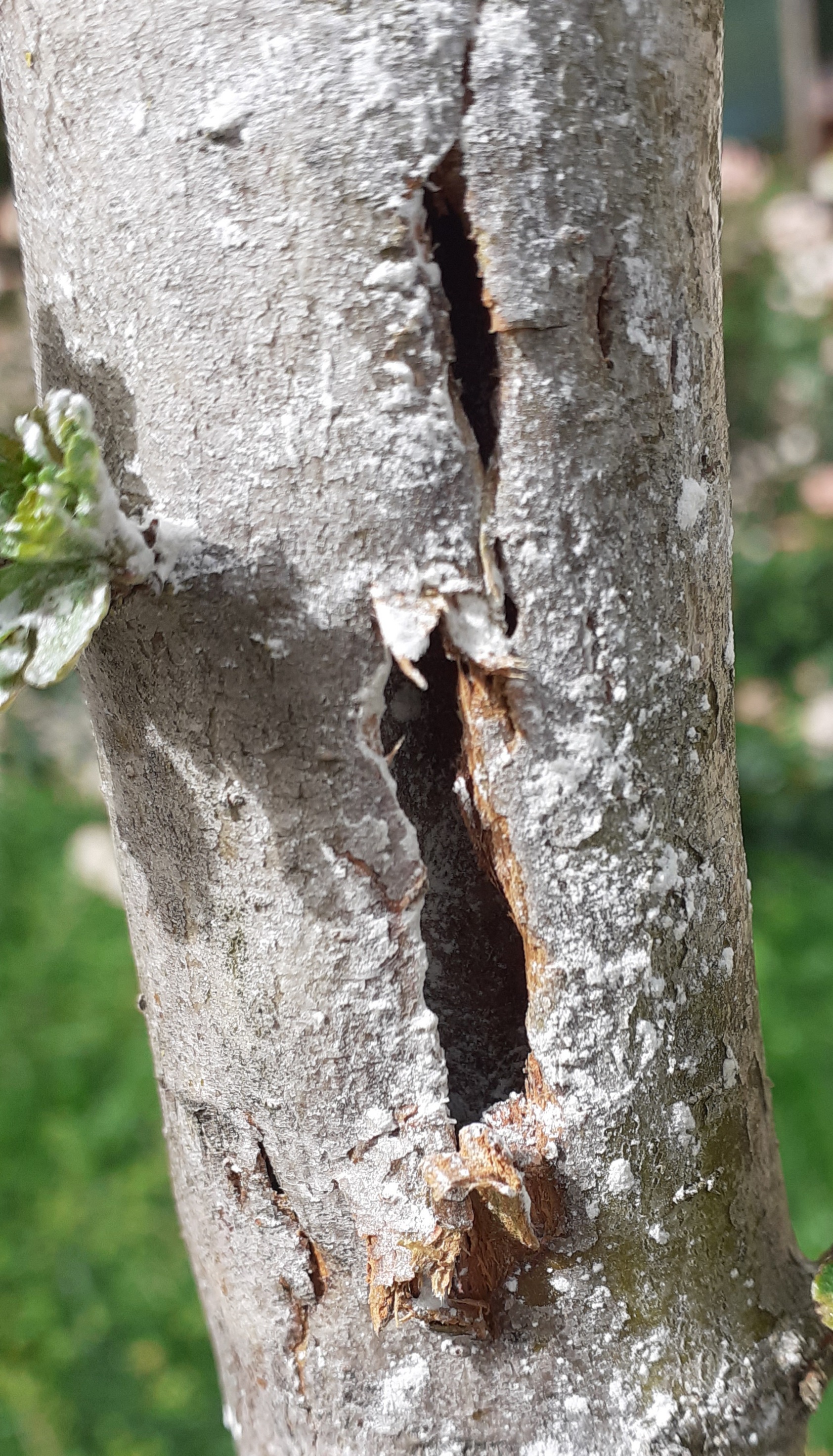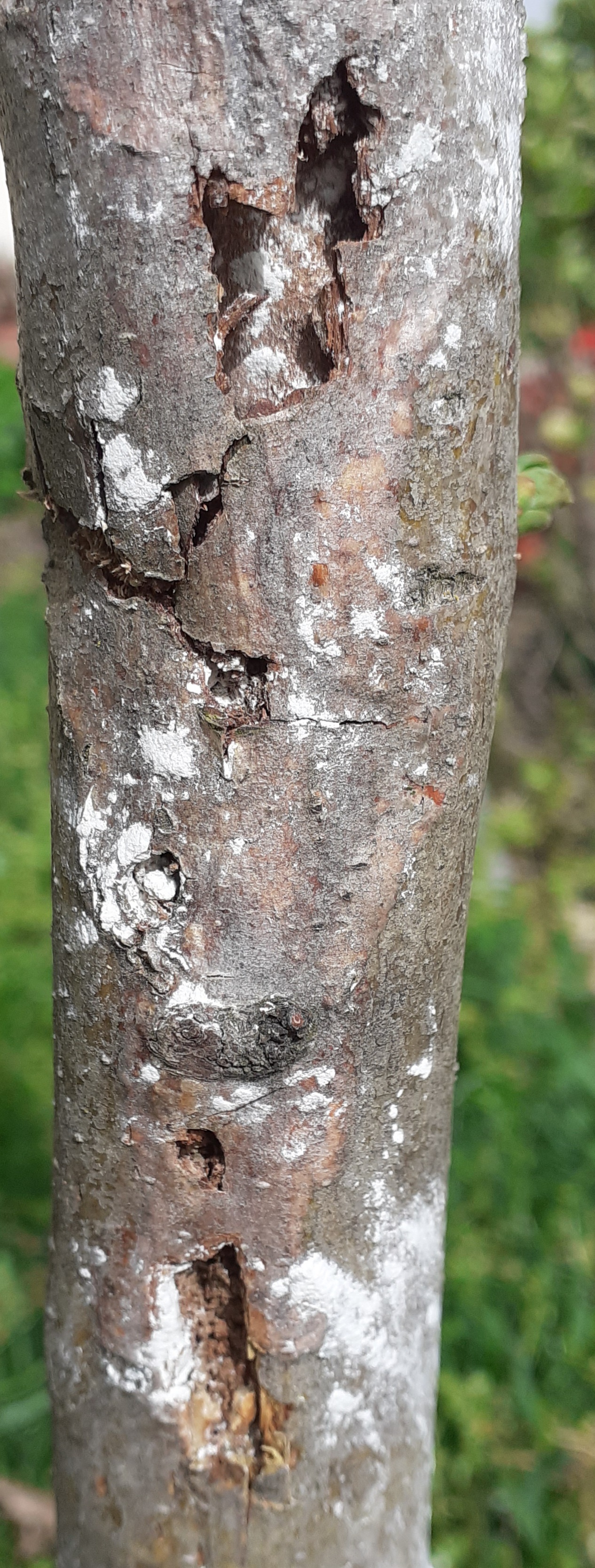 Sajnos a képet nem sikrült feltölteni. A lyukak, leírása szerint, a kis farontó lepke hernyójára utalhatnak. A lyukba drótot szúrogatva el kell pusztítani a hernyót, és a lyukat méhviasz alapú fasebkezelővel ki kellene tölteni, amennyire lehet.