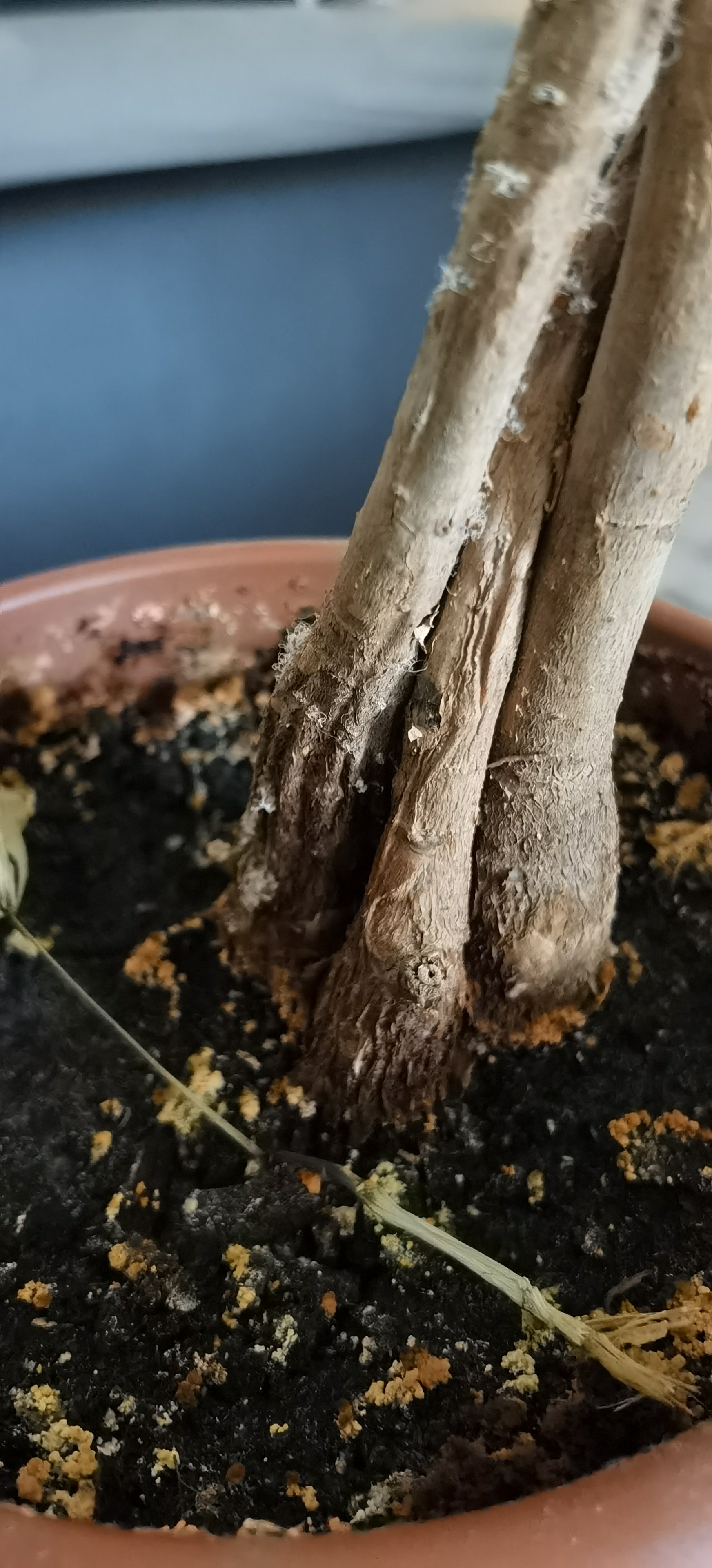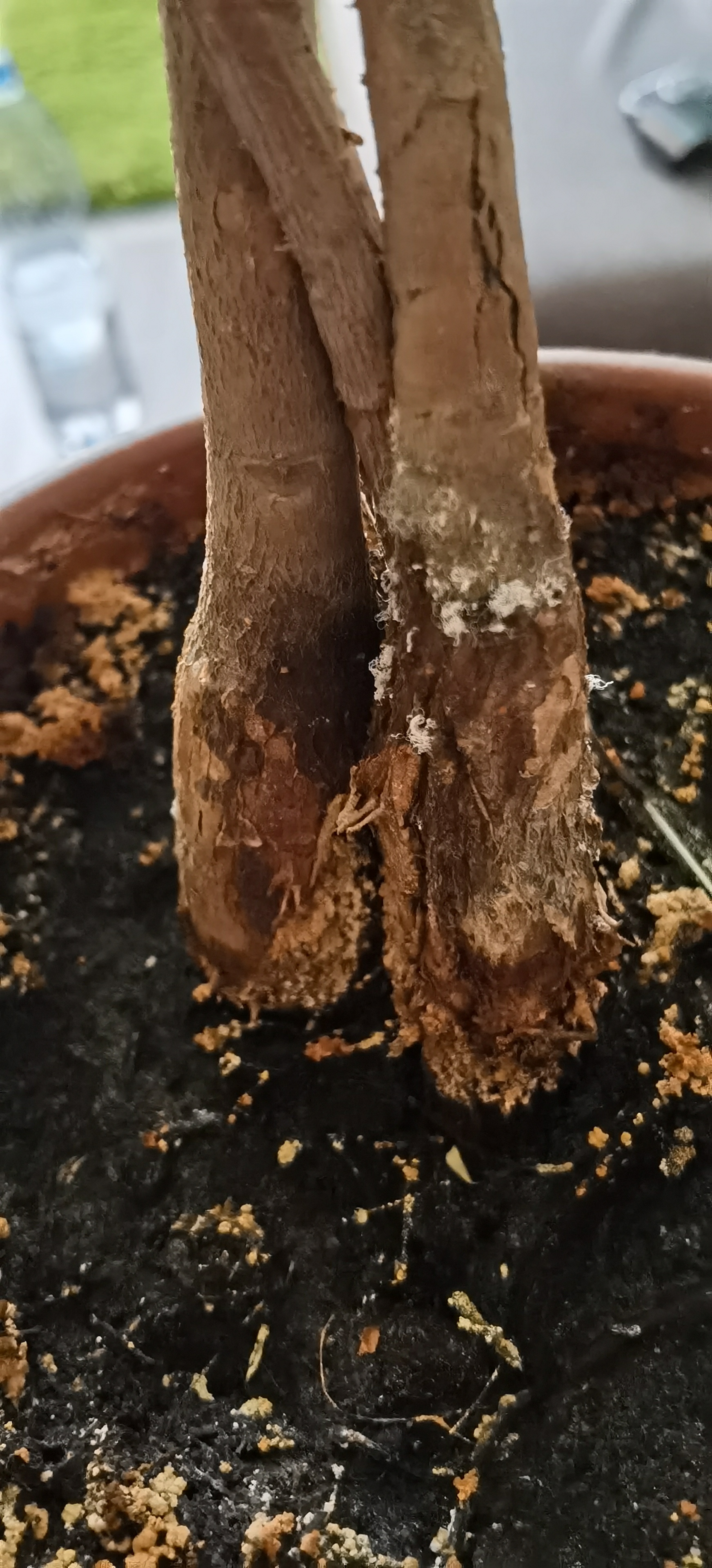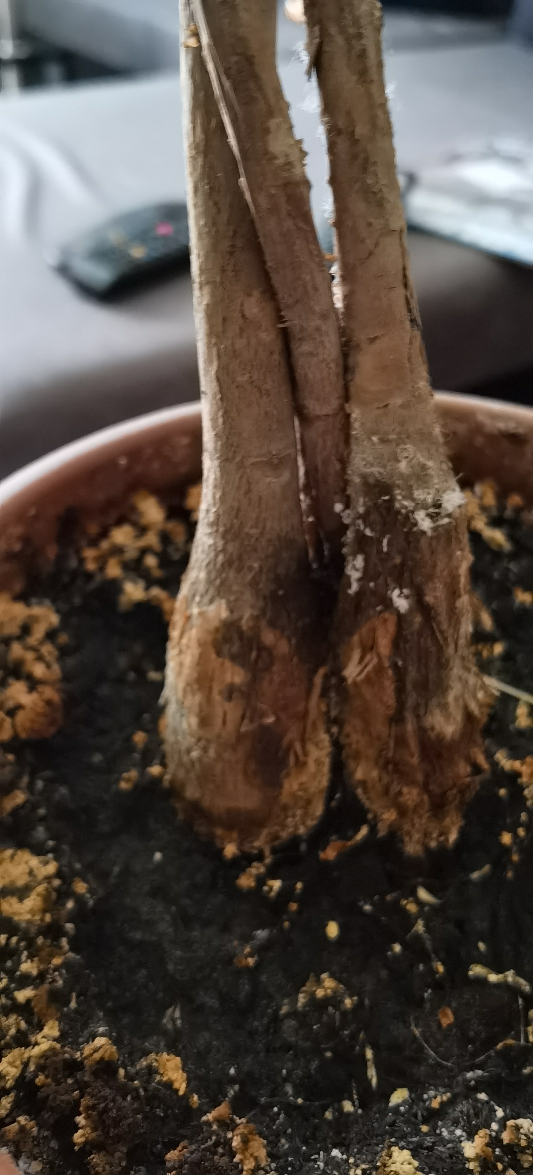 A képen úgy látom, hogy 5 növény van összefonva, amiből 3 pusztul. 2 menthető. Missza kell vágni addig, amíg szét lehet őket szedni (látszik ey új hajtás, afölött). A beteg növényeket eltávolítani, ész egészségeseket katuszföldbe átültetni. A száron a foltok túlöntözés jelei.