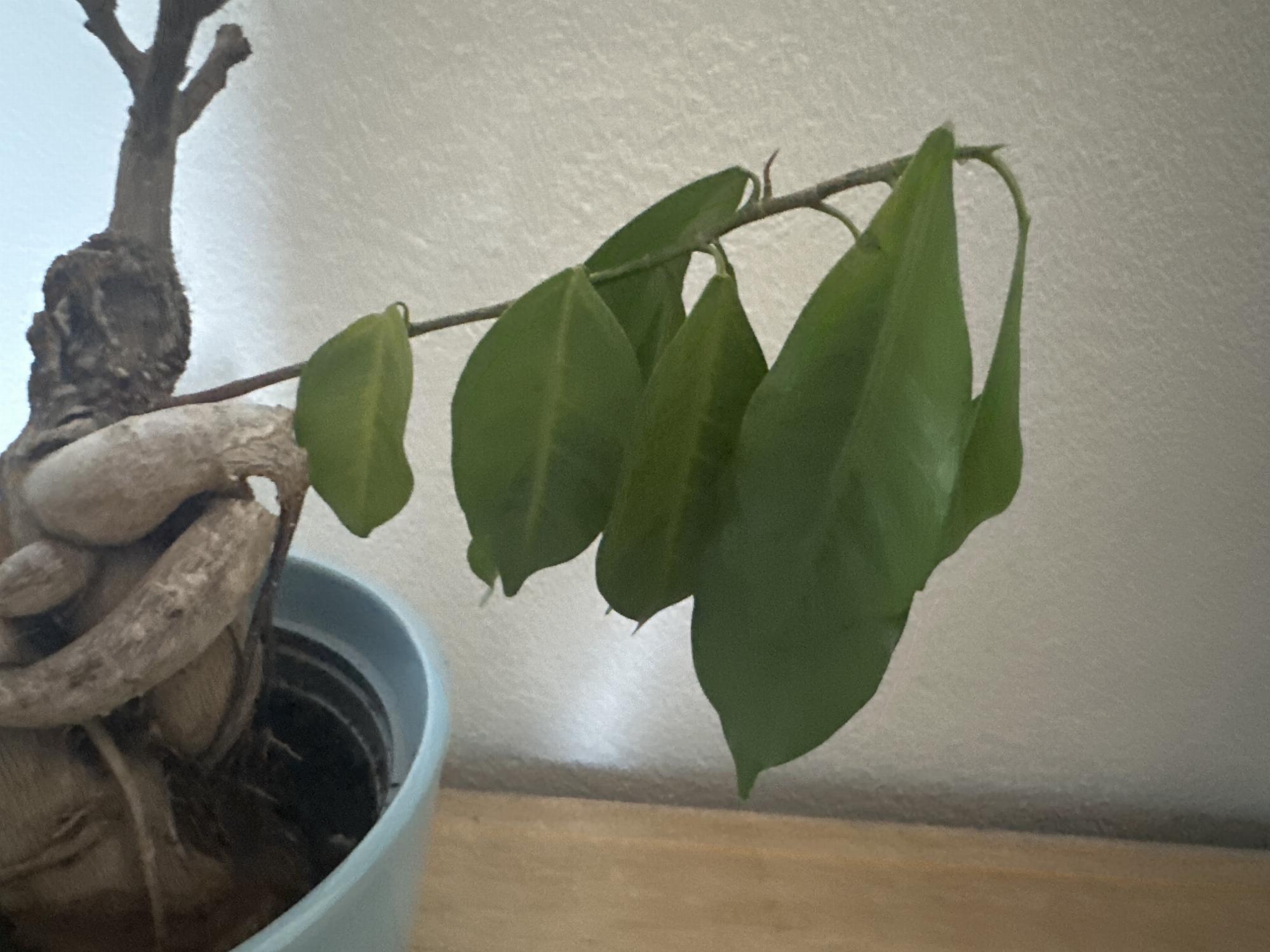 A képen a lassan 1 éves fikus ginsengem látható, körülbelől két hete kezdett romlani az álapota. Hetente egyszer öntözöm. A levelek lehajoltak, és érintés után lehullanak.