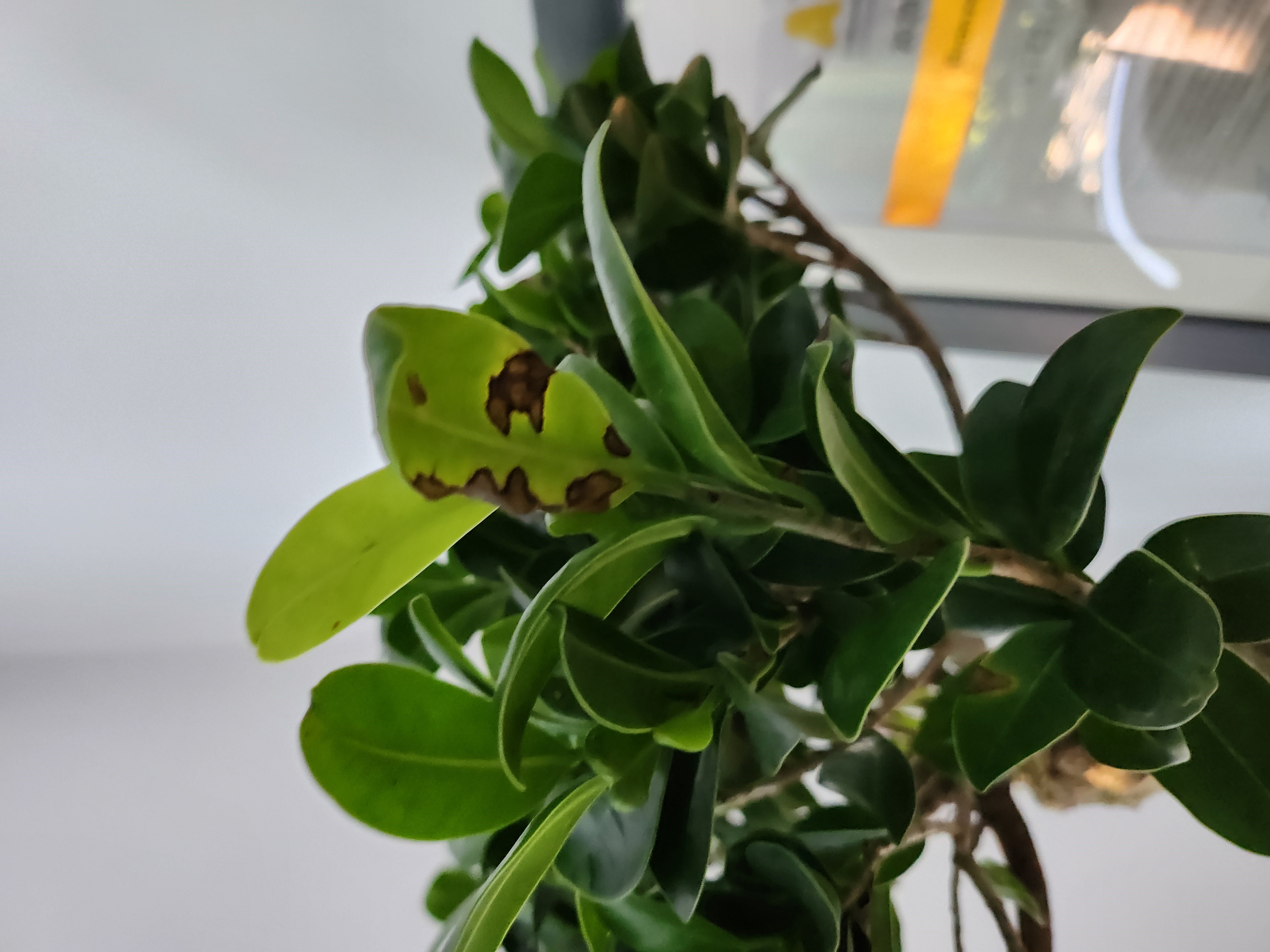 Kedves Erika! Valószínűleg a helyváltozás miatti treszzhatás. A Ficus ginseng szereti a kiegyensúlyozott körülményeket. Nem szereti a közvetlen napfényt, de az árnyékot sem, a túlöntözést és a kiszárdást sem. A tápanyegellátásról is gondoskodni kell. Káliumhiánynak látom a tünetet. A tünetes leveleket távolítsa el.