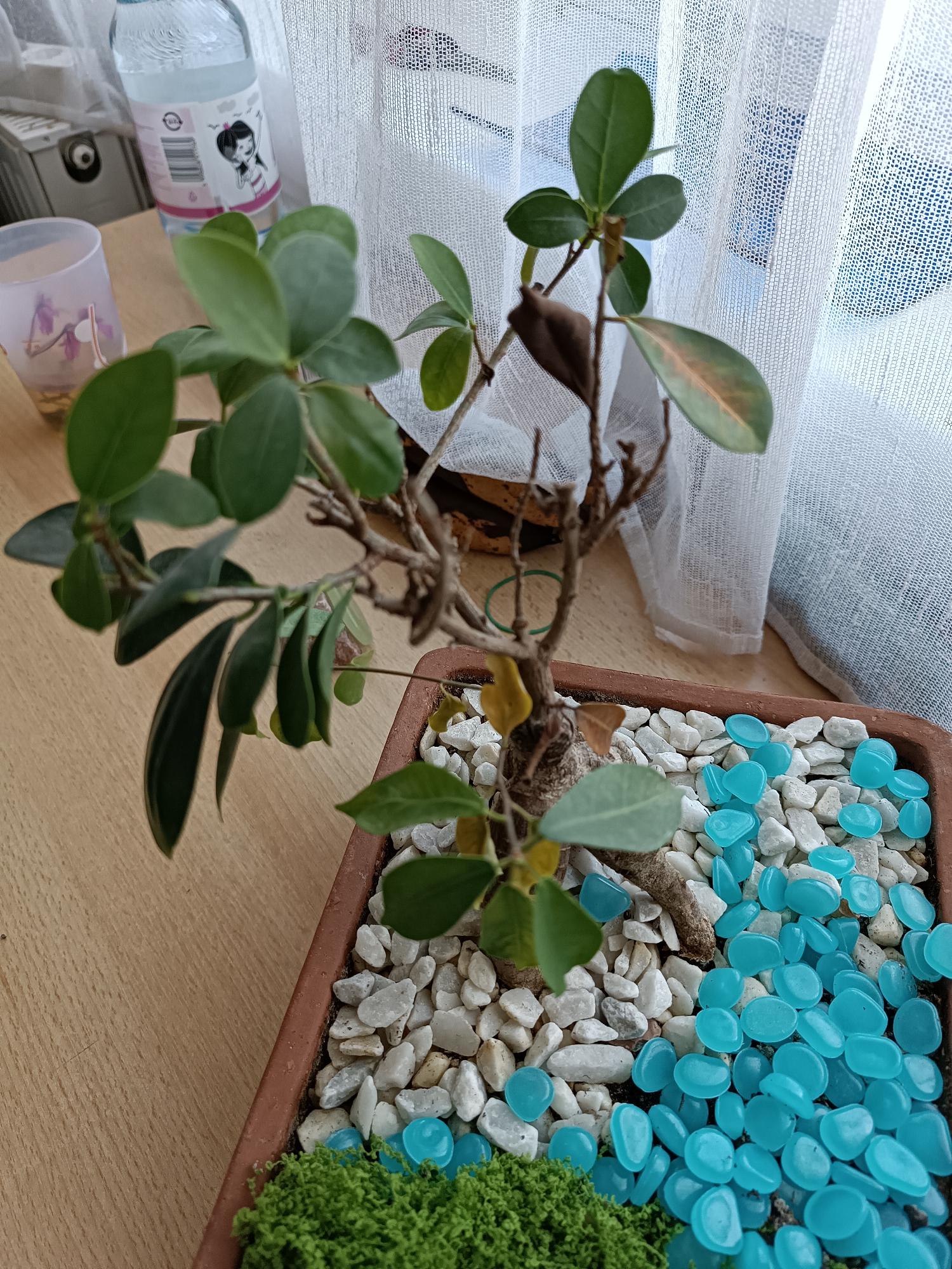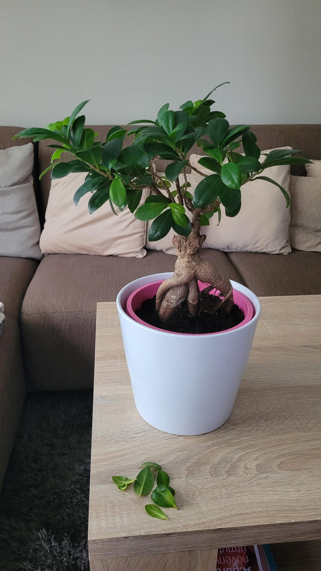 Kedves Dóra. A Ficus ginseng bonsai, mint minden Ficus a hirtelen környezetváltozásra érzékeny. Nyáron a szabadban, árnyékos helyen célszerű tartatni, télen 20 fok körüli, kiegyenlített hőmérsékletű szobában. Az radiátorból kisugárzó hő perzselheti a leveleket. Sok napfényt kíván. Lombját tilos permetezni vízzel.