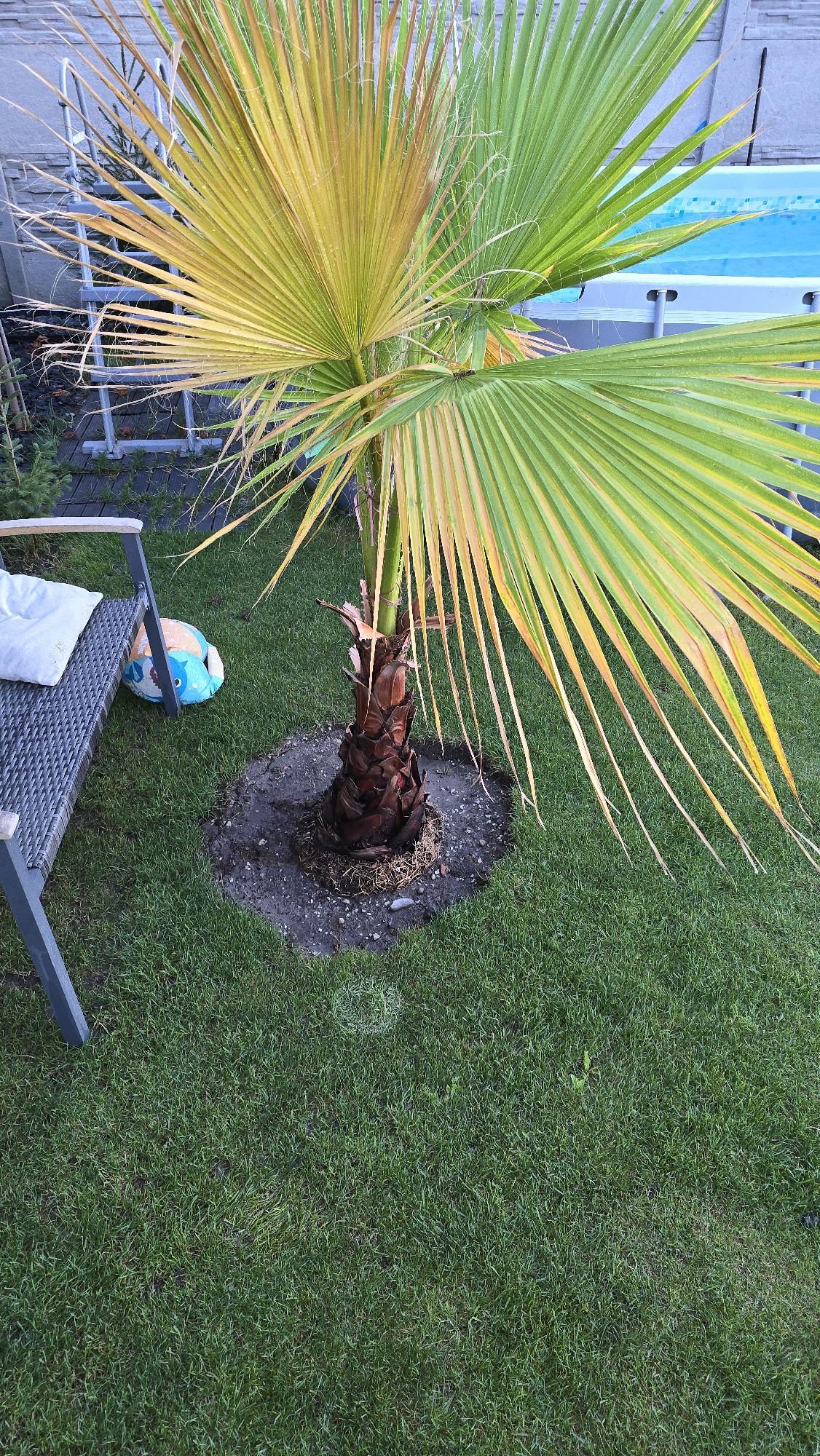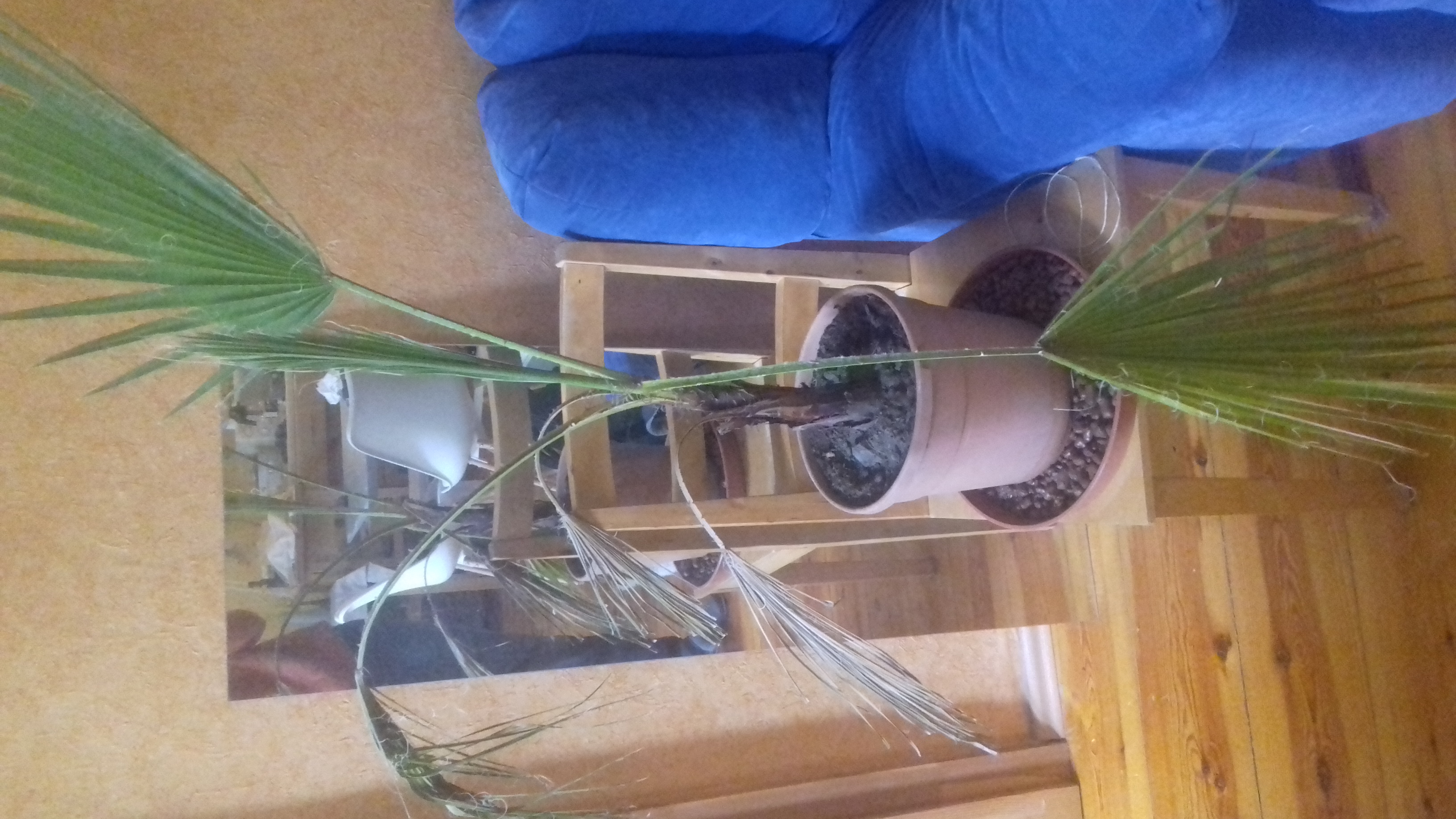 Pár hete vettünk egy Washingtonia Filifera pálmát. 50-60 cm magas a törzse, a teljes magassága így az edényben kb 170-180 cm. Még aznap átültettem, a teraszunkon dézsában tartjuk. Sajnos egy-két hete valószinű meg is betegedett. Az egyik levelét el kellett távolítani, de a többin is sárga foltok jelentkeztek és a levelek végei sárgulnak, száradnak. Először univerzális táppal tápoldatoztam. De már vettem a héten kimondott Pálma tápoldatot, magas vas és kálium tartalommal. Csináltam képeket a beteg levelekről, a tápoldatról és a teljes fáról. Mi lehet a probléma? Válaszát előre is köszönöm.