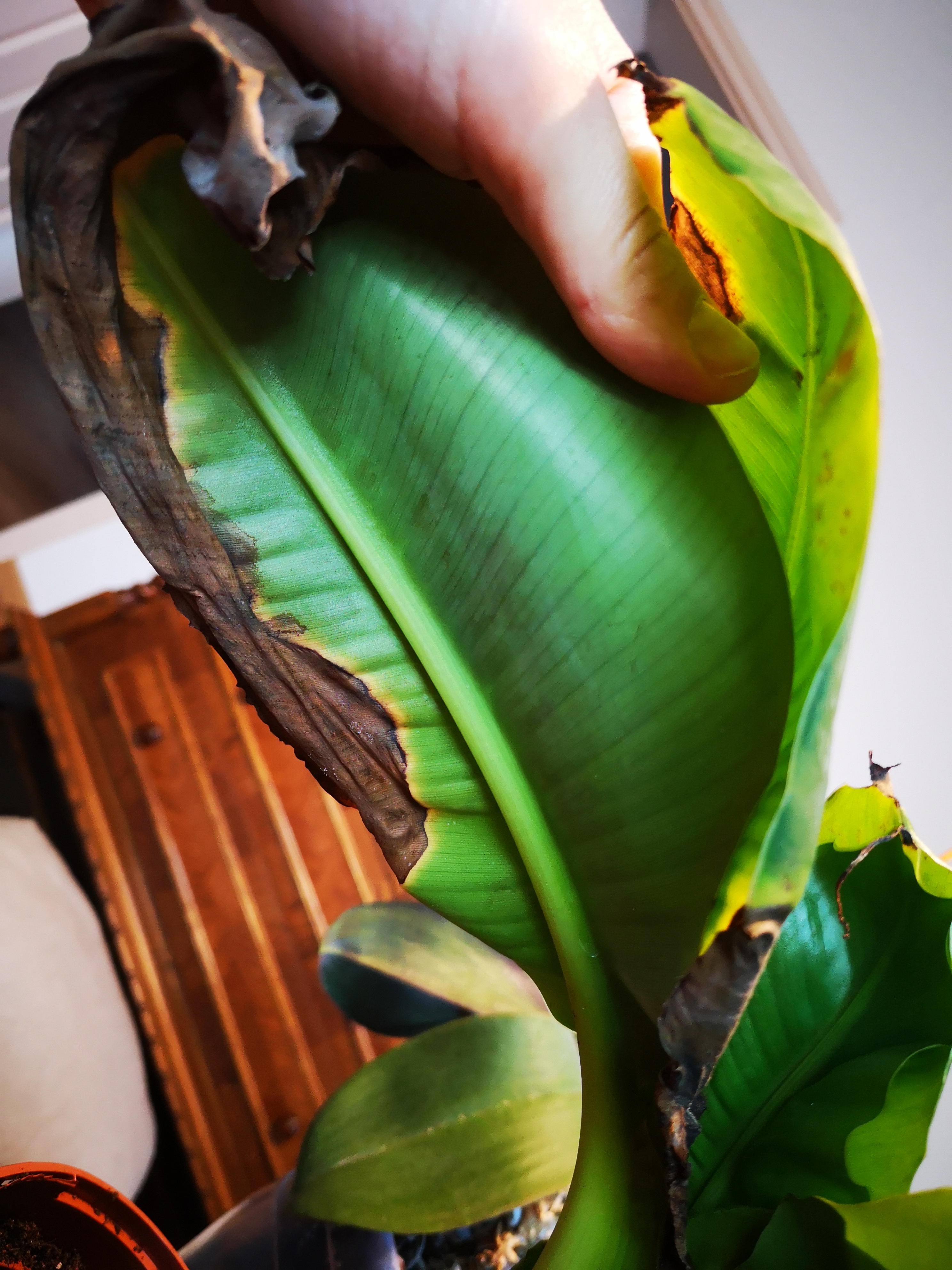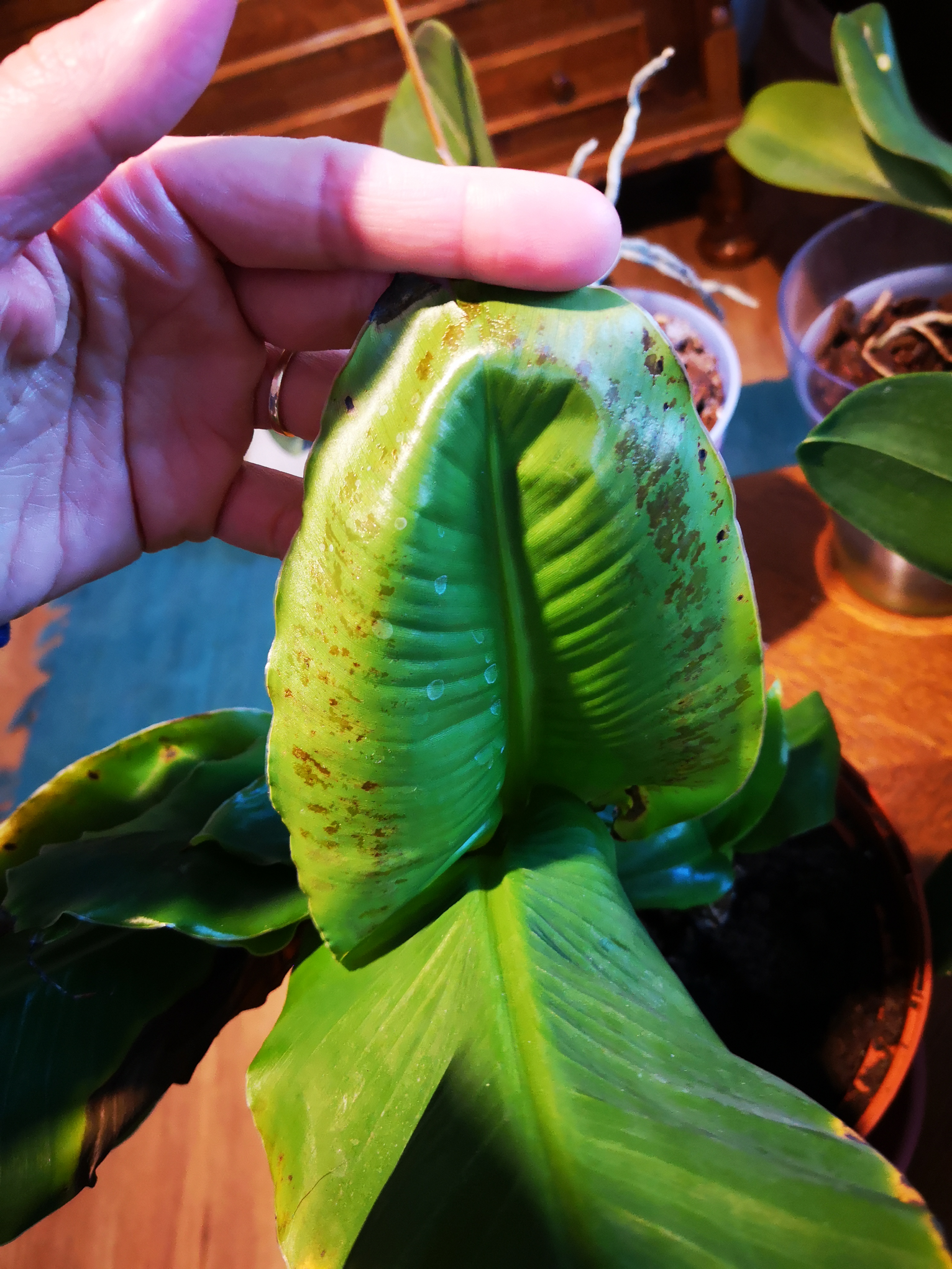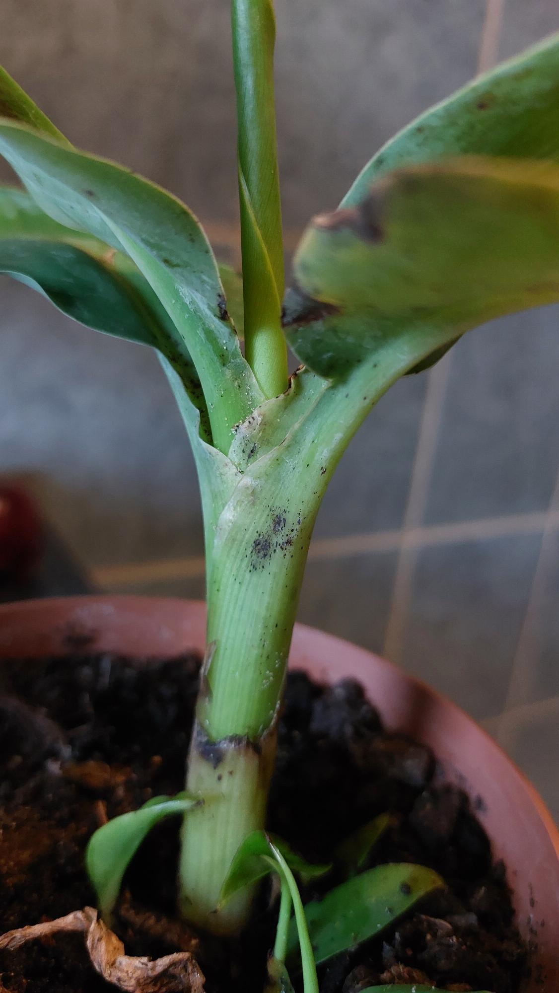 Nemrég kaptam egy szoba banánt, sajnos a pontos fajtát nem tudom. A középső új levelét már nálam hozta, viszont az alsó levelei és a szárrész sem tetszik nekem. Mik okozhatják a sérüléseket és a barna-fekete foltokat a levélen? A szár részen fehér kis pöttyöket is látok, ezek fertőzések, kártevők? Mivel tudnám kezelni? Köszönöm!