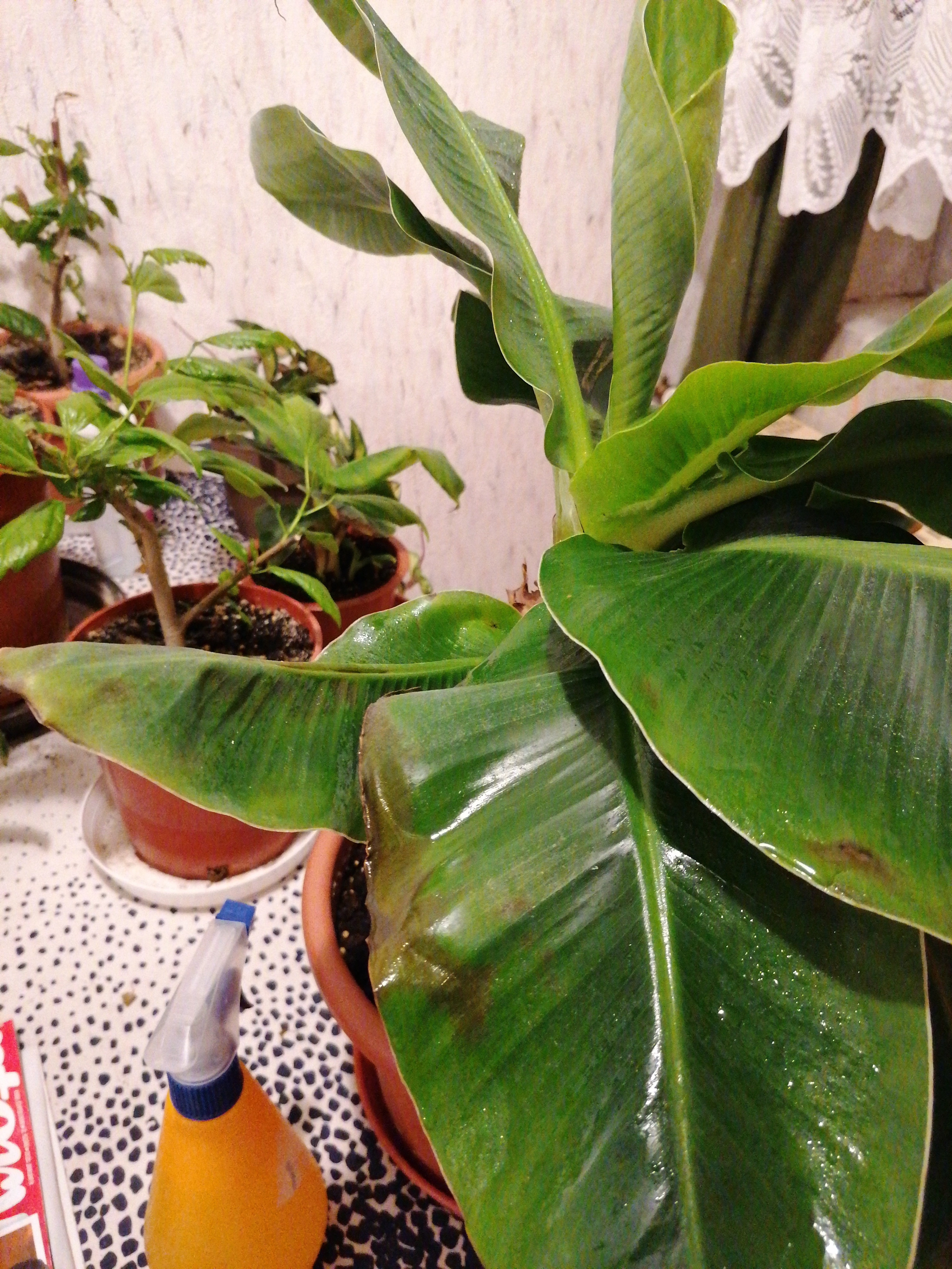 A foltos leveleken és a száron baktériumos betegség tünetei láthatók. Az ilyen károsítók általában tartási hiba - pl. túlöntözés, sötét hely, kevés pára - következtében, a legyengült növényen lépnek fel. Baktérium ellen a réztartalmú készítmények hatásosak -7-10 naponta permetezve, 3 alkalommal. A foltos, a gyönyörű növény esztétikumát csökkentő leveleket érdemes eltávolítani. Nem kell lefejteni, csak levágni. Idővel a csonk elszárad és leesik. A banán nagyon szereti a fényt, még a közvetlen napsütést is.