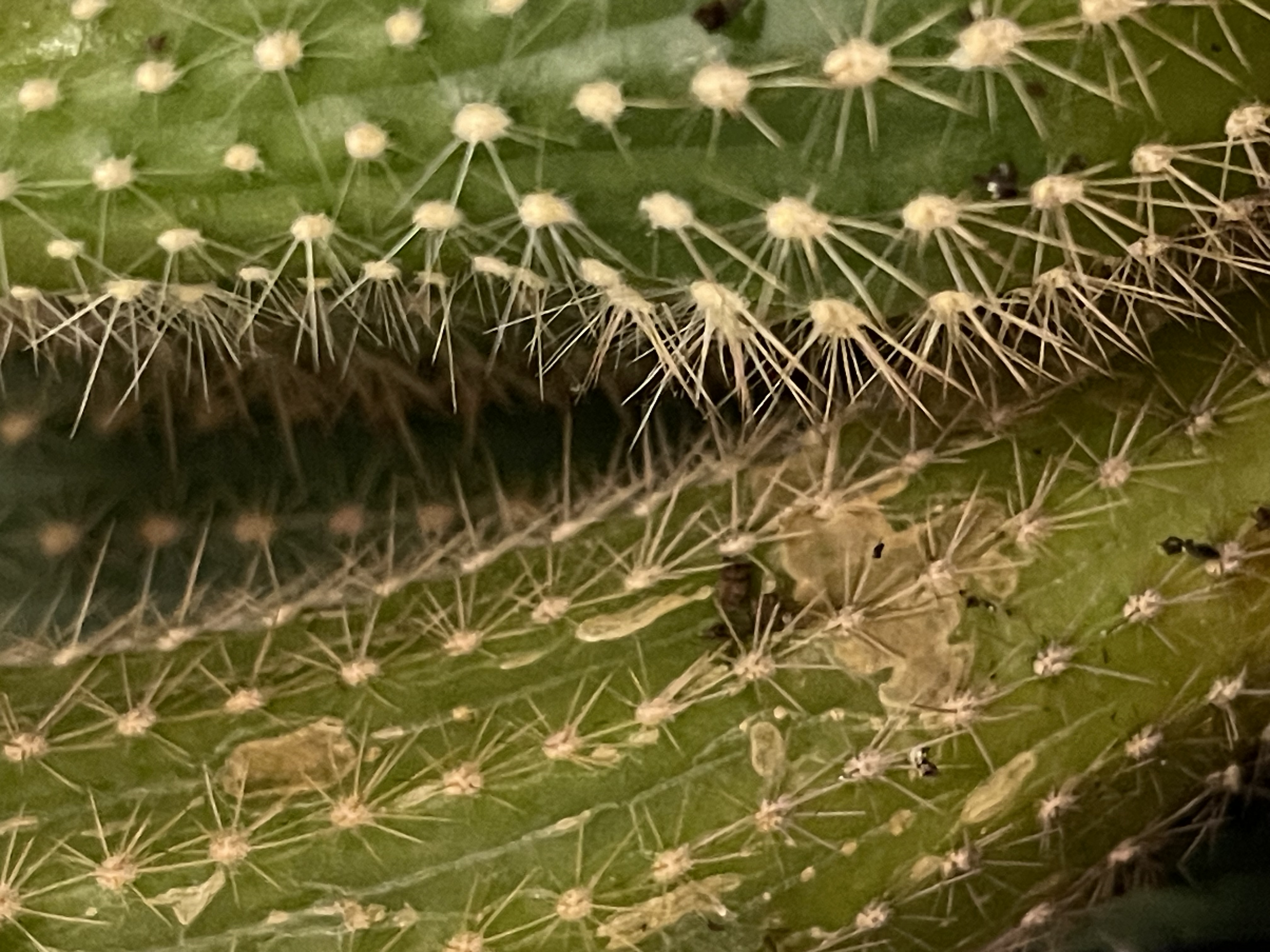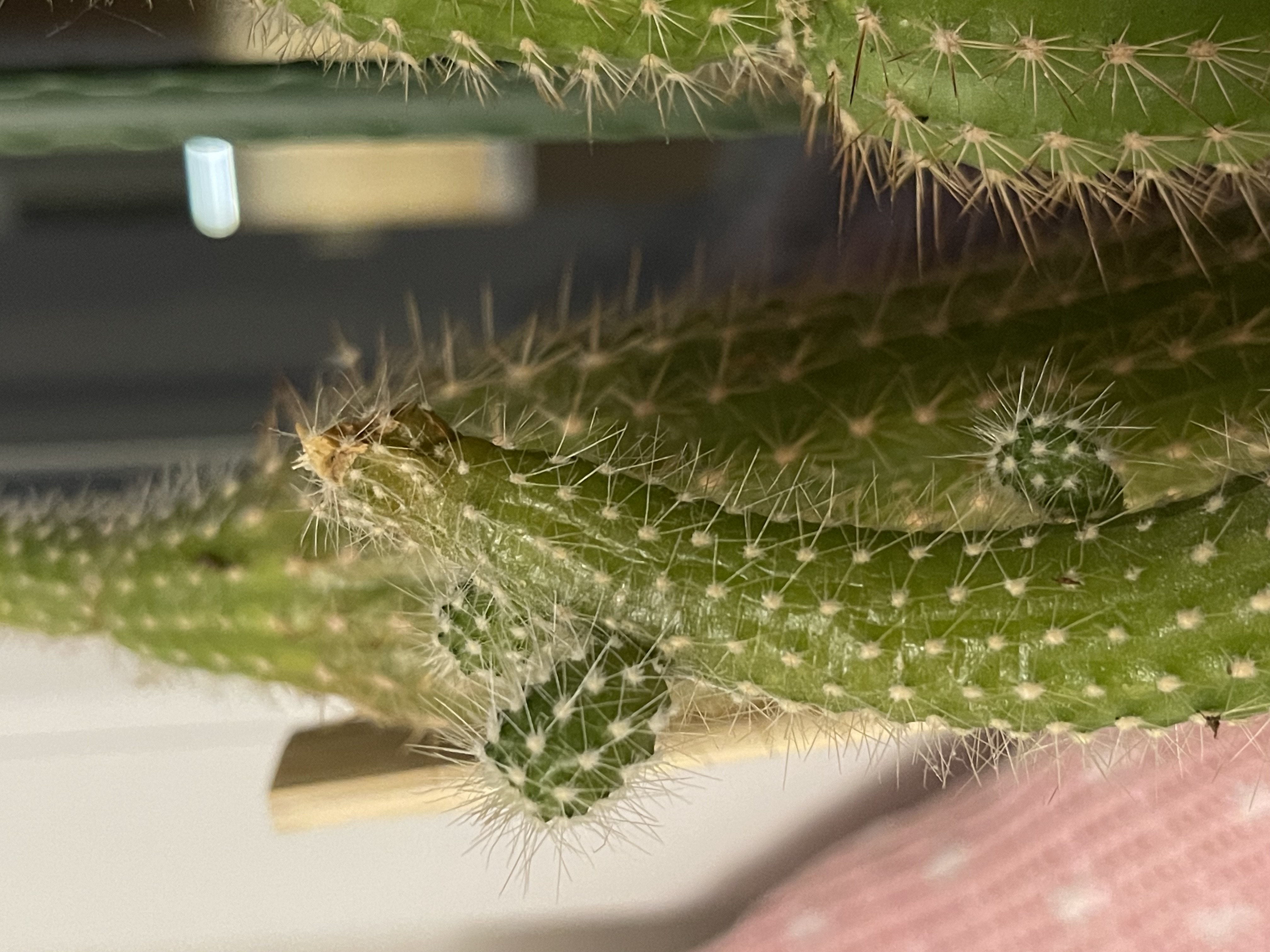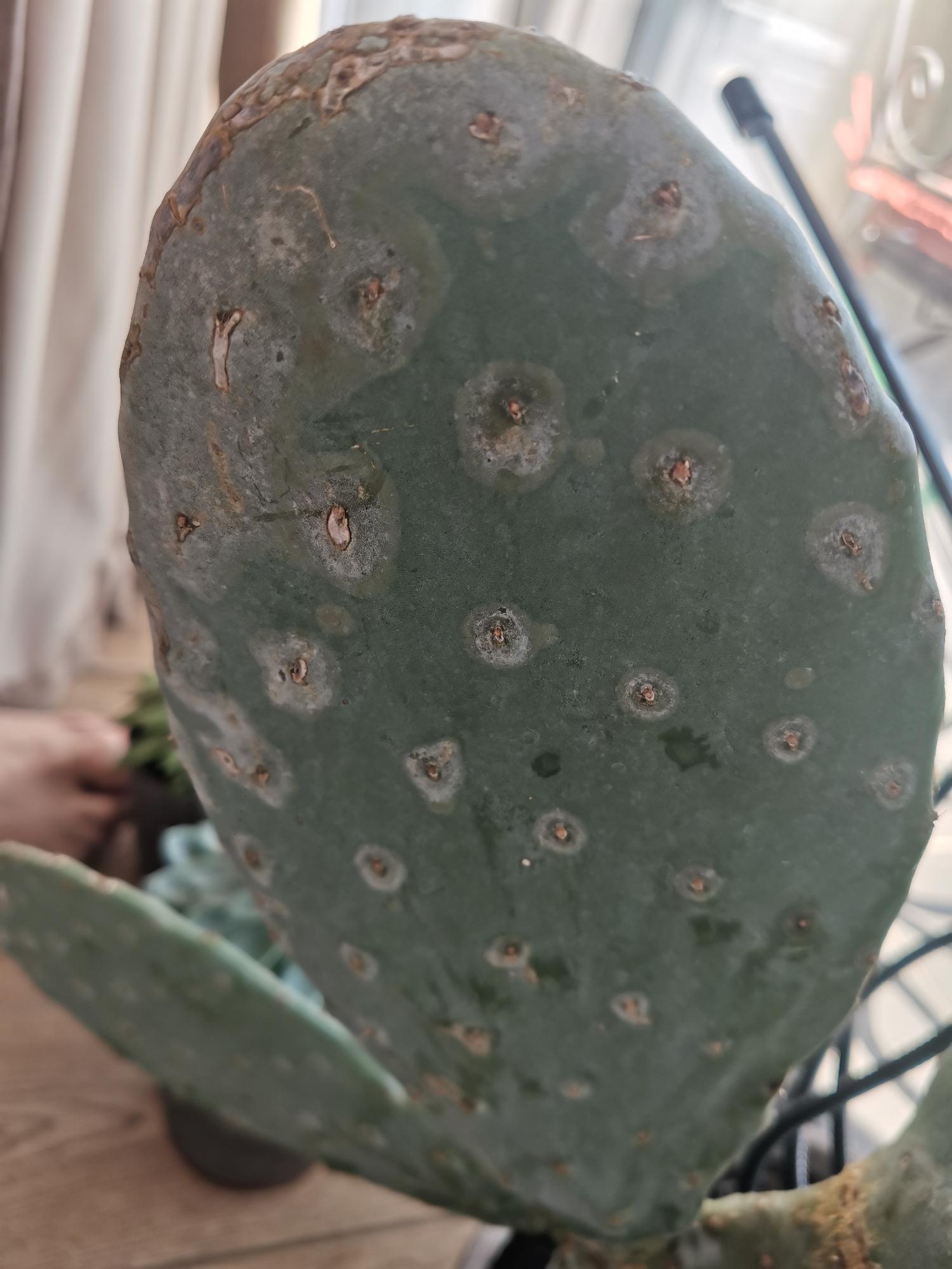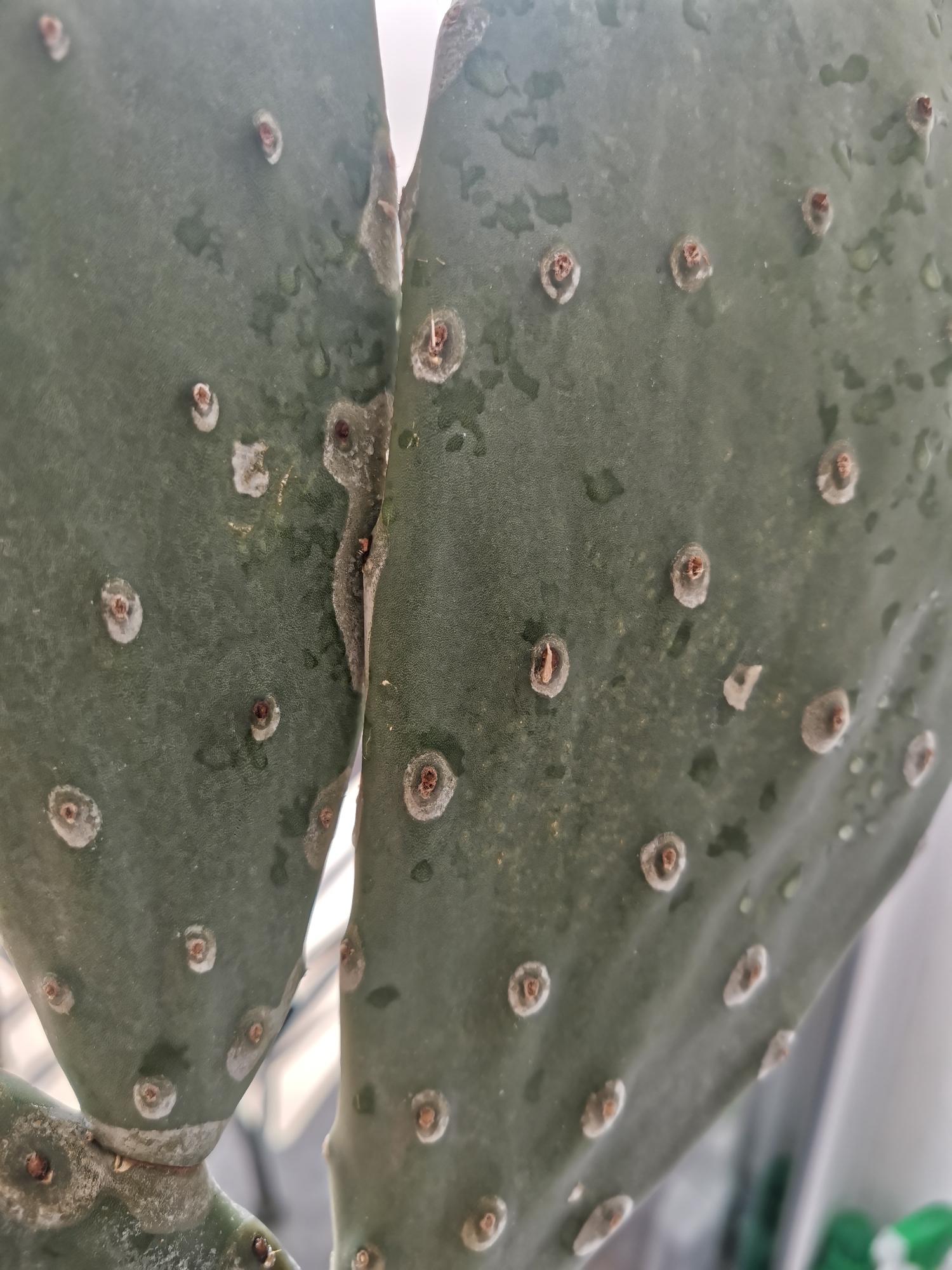 Segítségét kérném az Opuntia Ficus Indica-m problémájának meghatározásában. Napsütötte ablakban tartom október közepe óta, növénynevelő lámpával kiegészítve 22 fok körüli hőmérsékleten. Az öntözéssel hibáztam, hagytam kiszáradni teljesen a földjét és ráncosodás jelent meg 1 régebbi mellékágon. Gombásodásra gyanakszom, a napfény által nem ért oldalon jelentkeztek a tüskék körül fehéres foltok. Bio zsurlókivonat permetszerrel lefújtam és lemosta a fehéres foltot, ott alatta sárgászöld maradt. Mellékelem a képeket. Jók a feltételezéseim, vagy esetleg más probléma áll a háttérben?