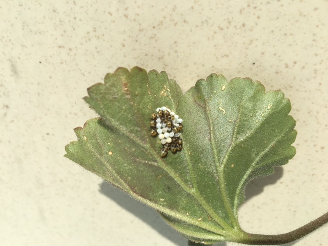 A képeken poloska lárvák láthatók. Az elsőn az ázsiai márványos poloska lárvája, míg a másodikon a tojások mellett a zöld vándor poloska lárvái. Elég ha eltávolítja és megsemmisíti a poloskákat. Kontakt hatóanyagú rovarölőszerekkel jól lehet őket írtani.