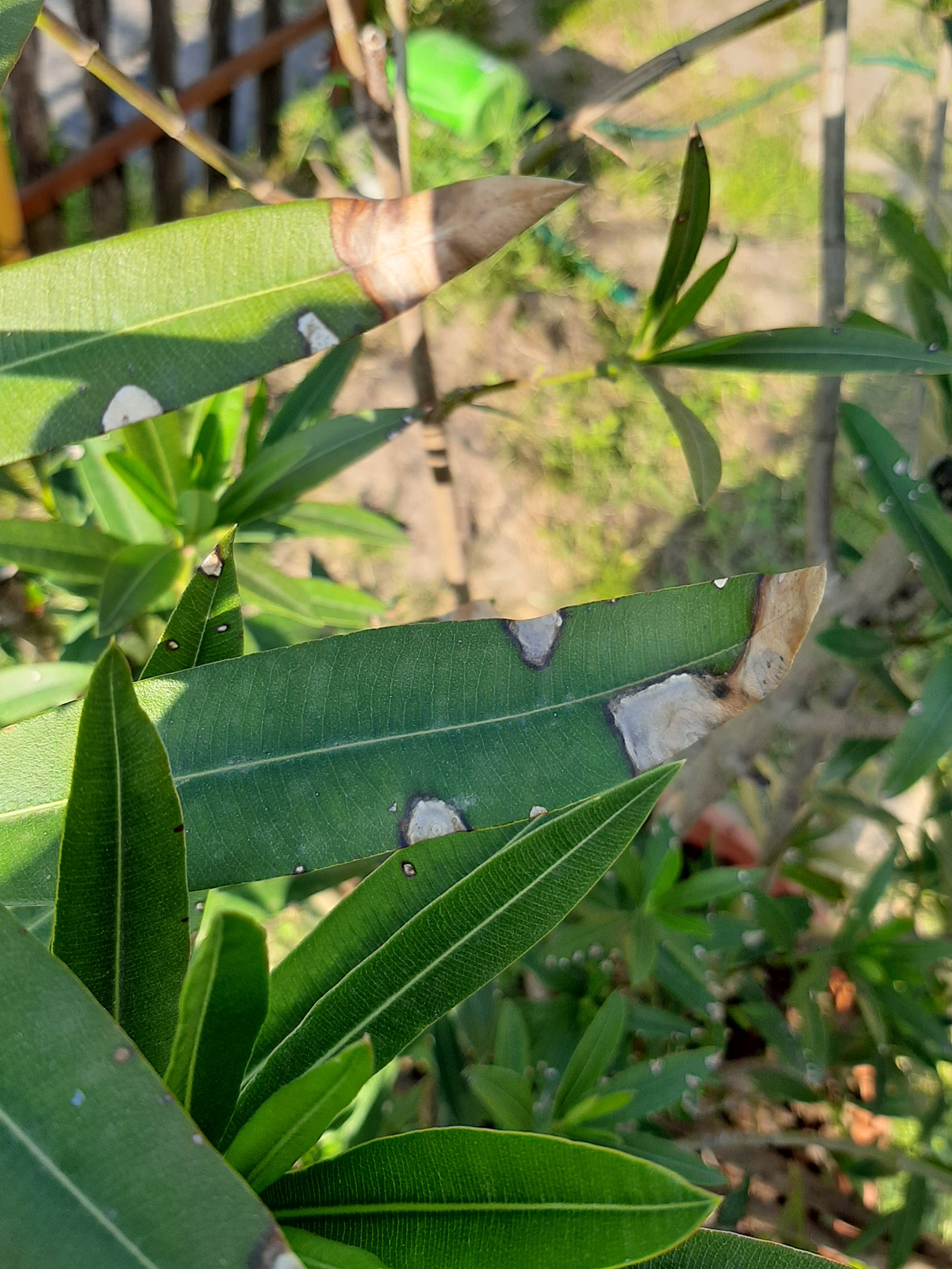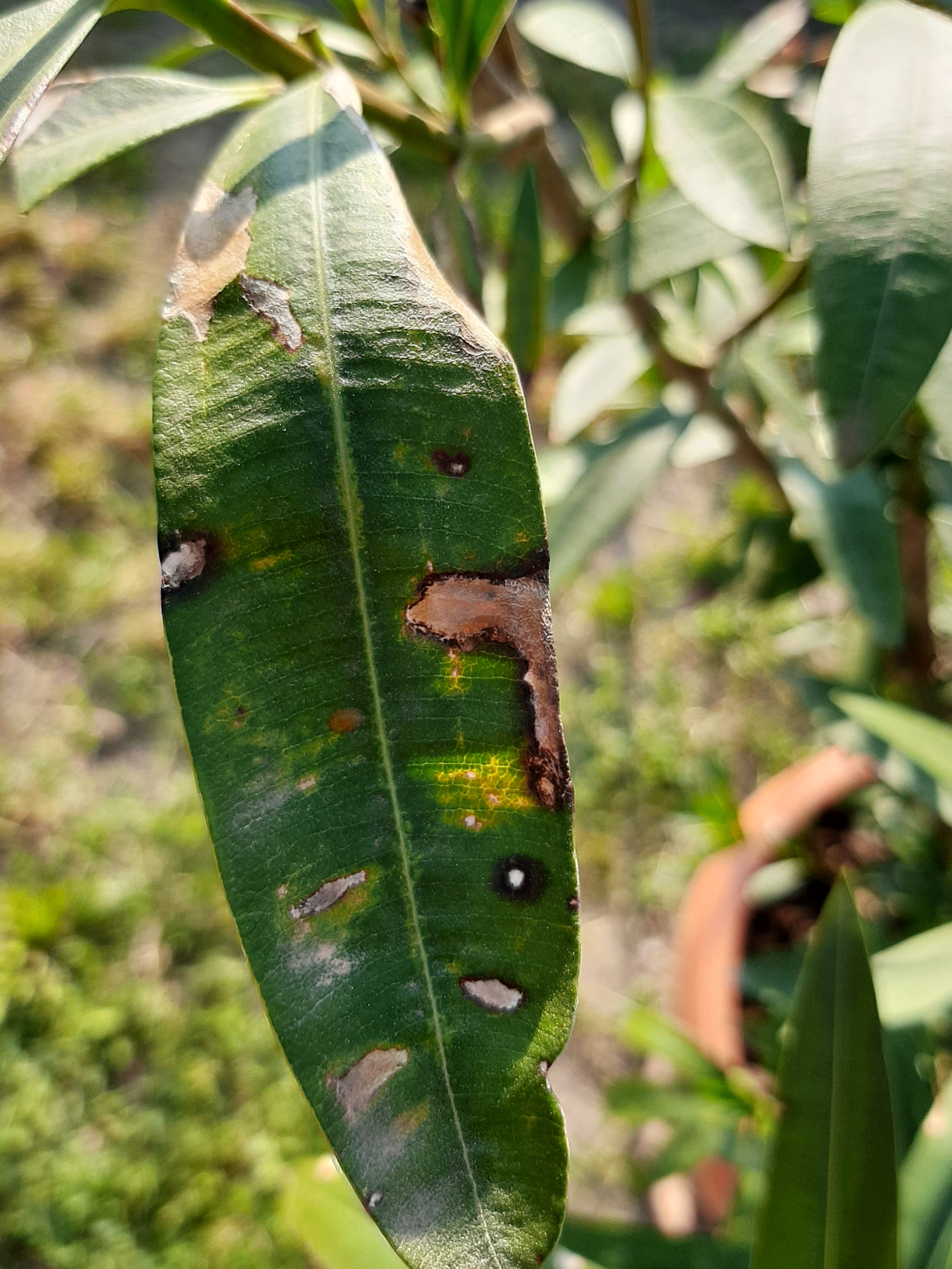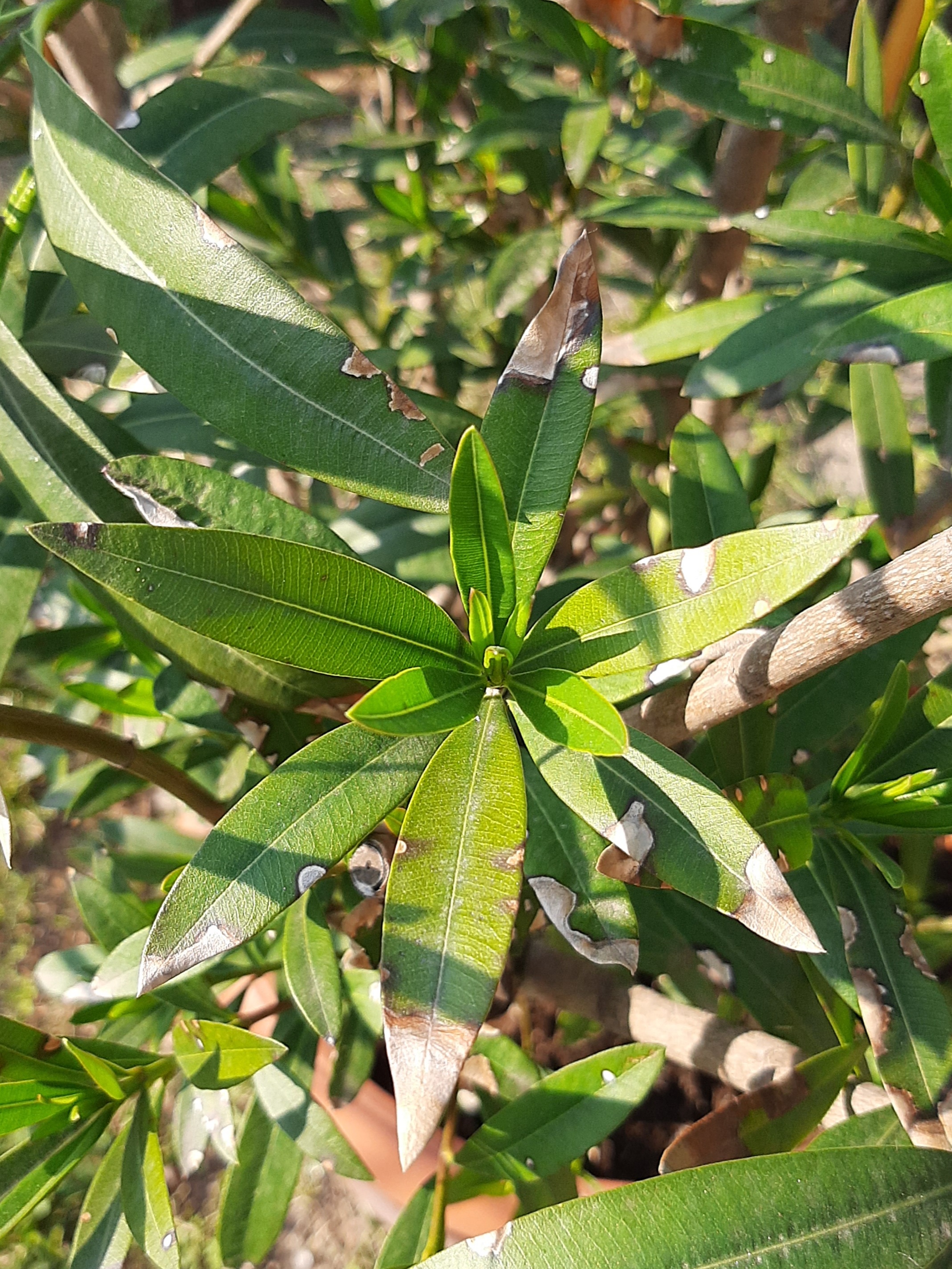 Huszonéves leanderem levelei szélén furcsa fehér, sárga és barna foltokat látok. Egyelőre csak néhány ágon, de ott szinte mindegyik levélen. Néhány levél fonákján pedig barnás-fekete csomók is vannak. Illetve fotózás közben vettem észre az egyik levélen egy "lakót". Nagyon kicsi, gombostű fej méretű.