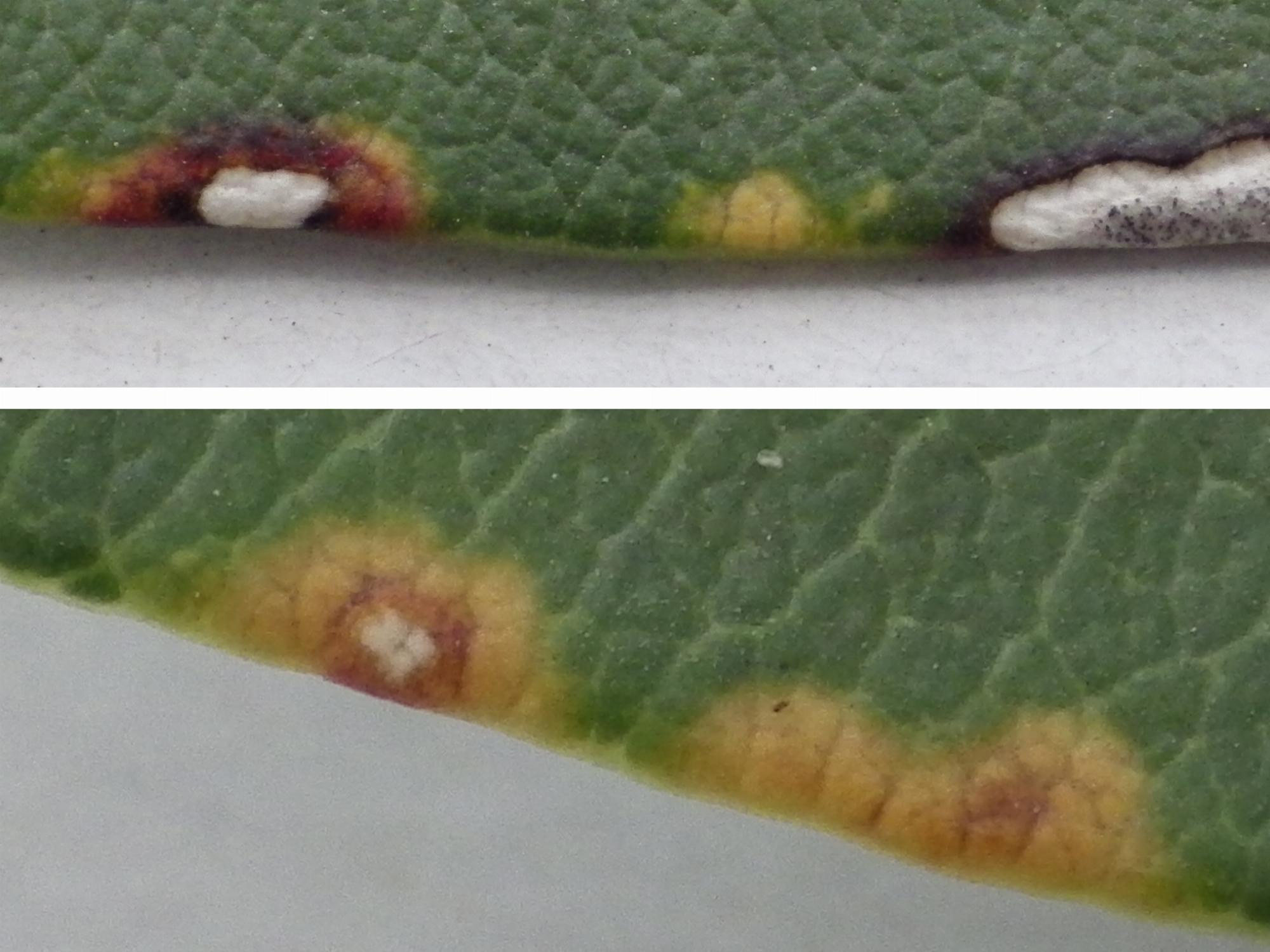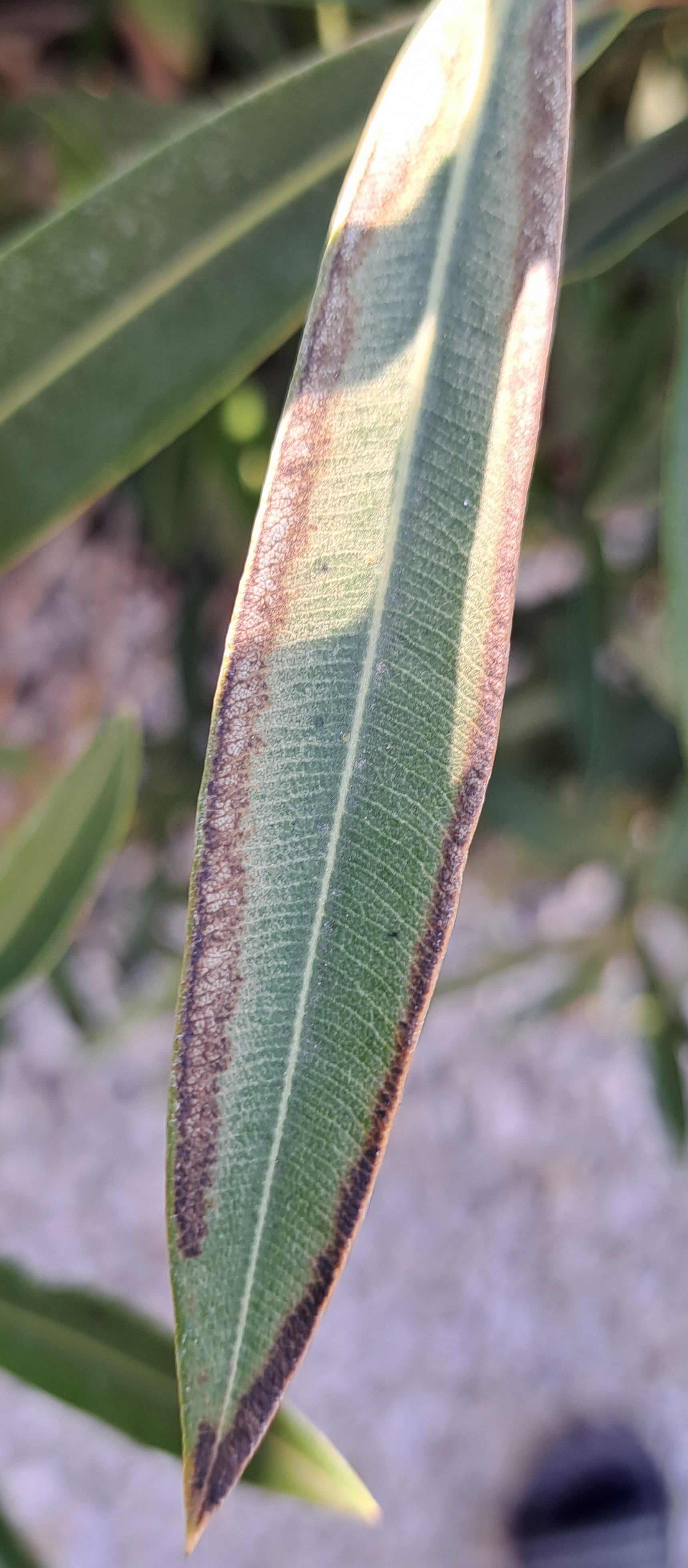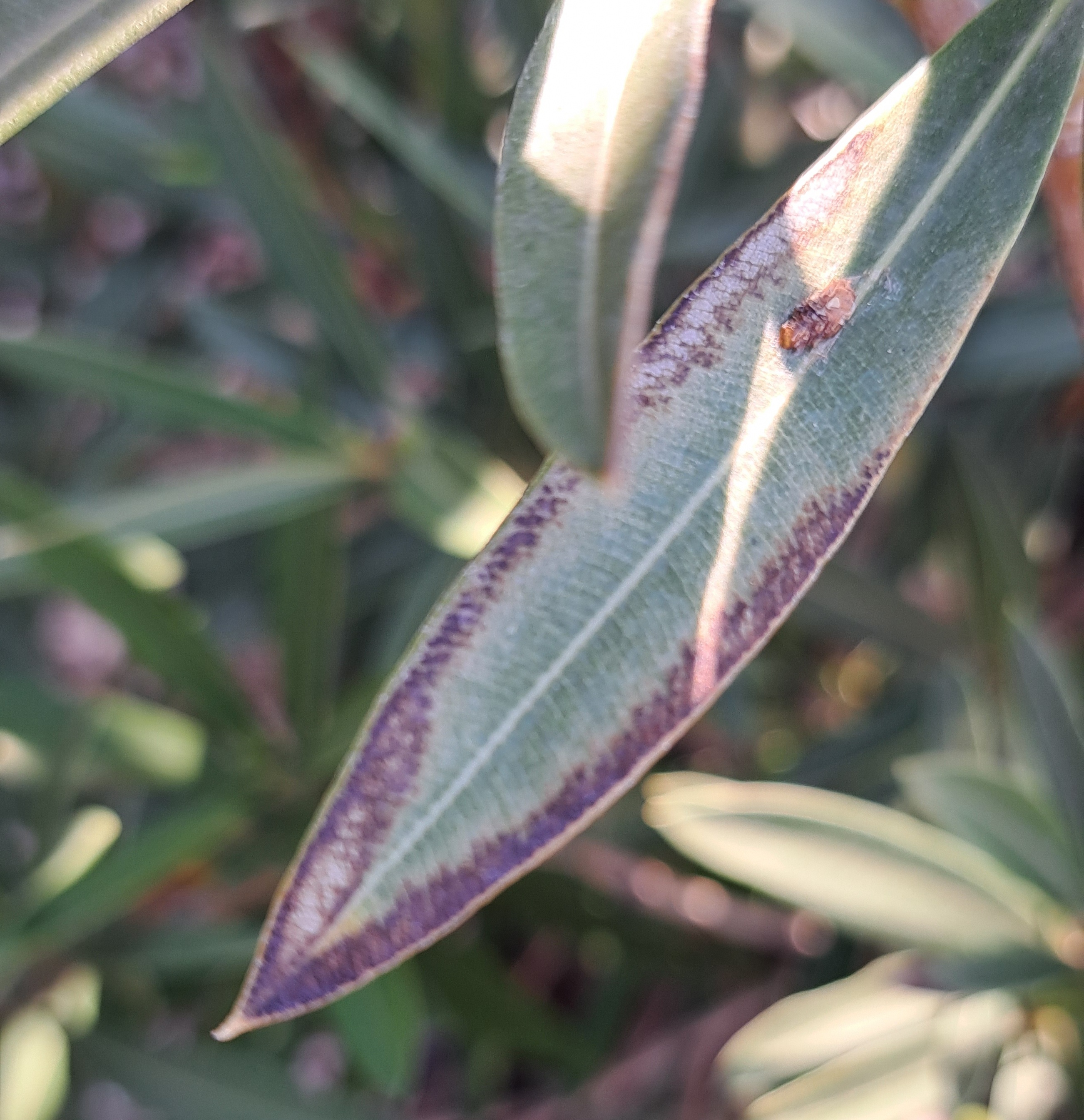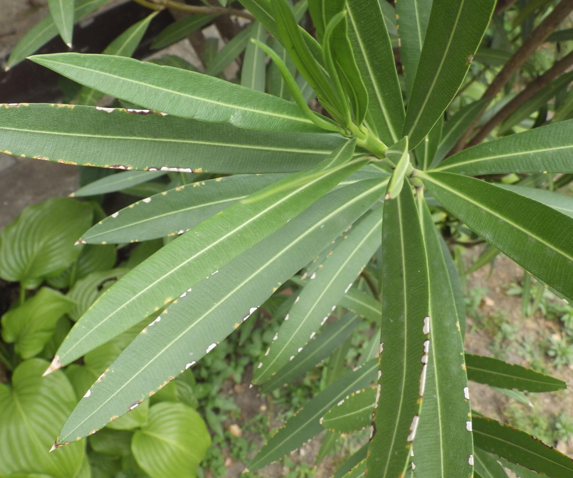 Huszonéves leanderem levelei szélén furcsa fehér, sárga és barna foltokat látok. Egyelőre csak néhány ágon, de ott szinte mindegyik levélen. Néhány levél fonákján pedig barnás-fekete csomók is vannak. Illetve fotózás közben vettem észre az egyik levélen egy "lakót". Nagyon kicsi, gombostű fej méretű.