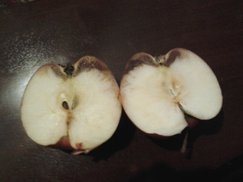 Jó volna egy kép az alma alsó részéről , acsészelevelei környékéről. Elképzelhető, hogy botrítisz, ami már virágzás idején megfertőzi a növényt, és a termésen érés időszakában jelenik meg, vagy kívül még akkor sem látható. Fehér penészkiverődés nincs a gyümölcsökön?