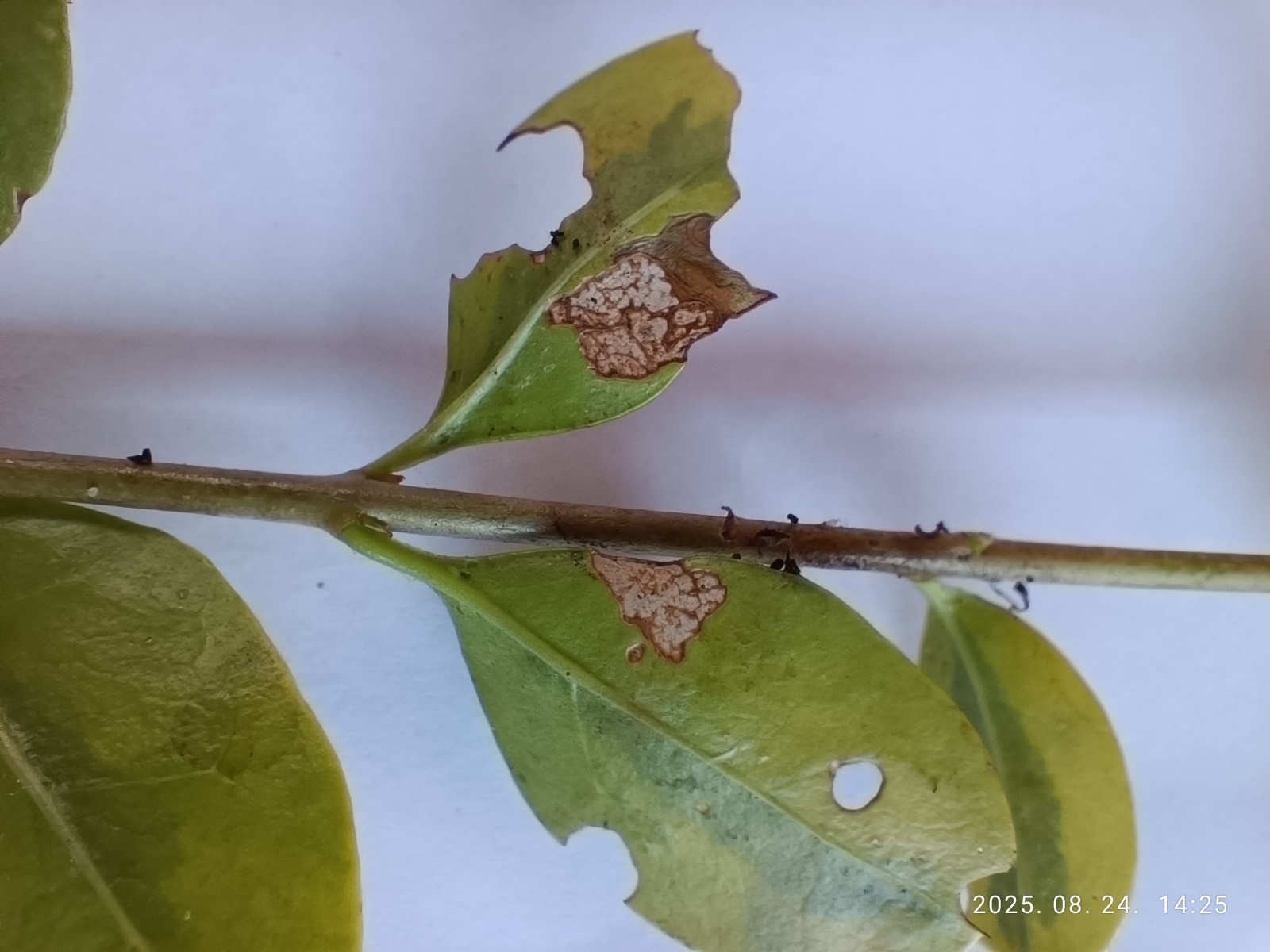 A leveleket levélbarkók cakkosítják. Ha megírja, milyen szer(ek) van(nak) otthon a fagyaltripsz ellen, meg tudom mondani, hogy ezek ellen is jó(k)-e. A levélbarkók egyébként nem olyan veszedelmes kártevők, bár a tünetek valóban feltűnőek néha.