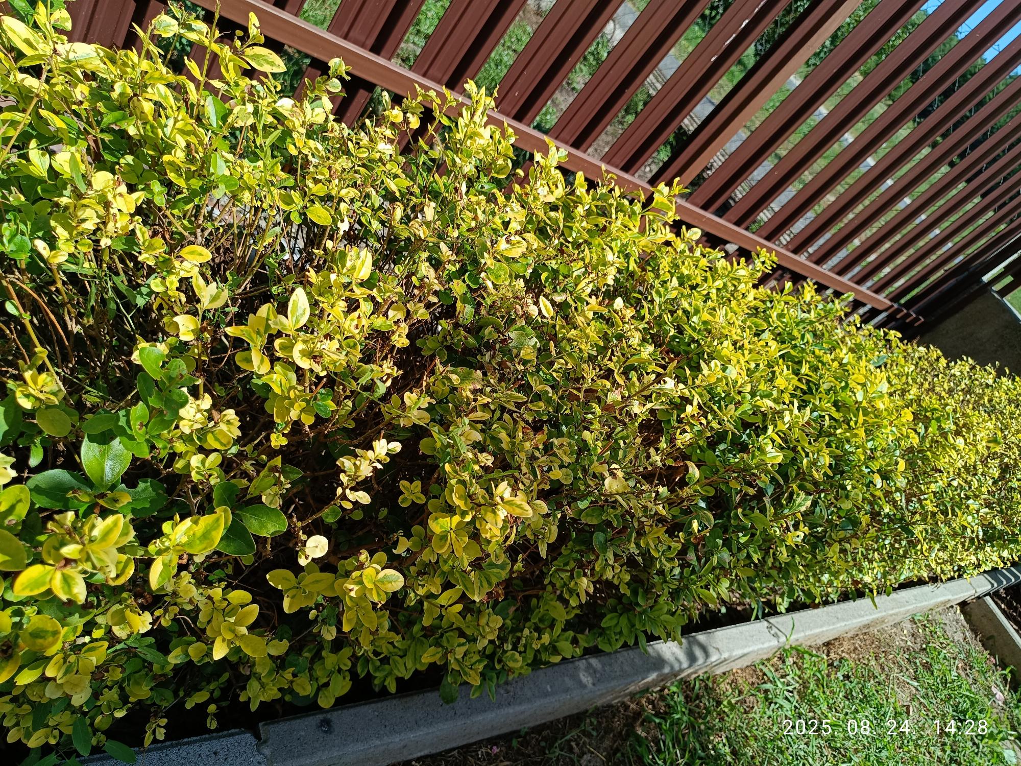 A növényeink csepegtetve vannak rendszeresen,időjárás szerint, tavasszal kapott pétisót. Évente 3-4 alkalommal nyírjuk.