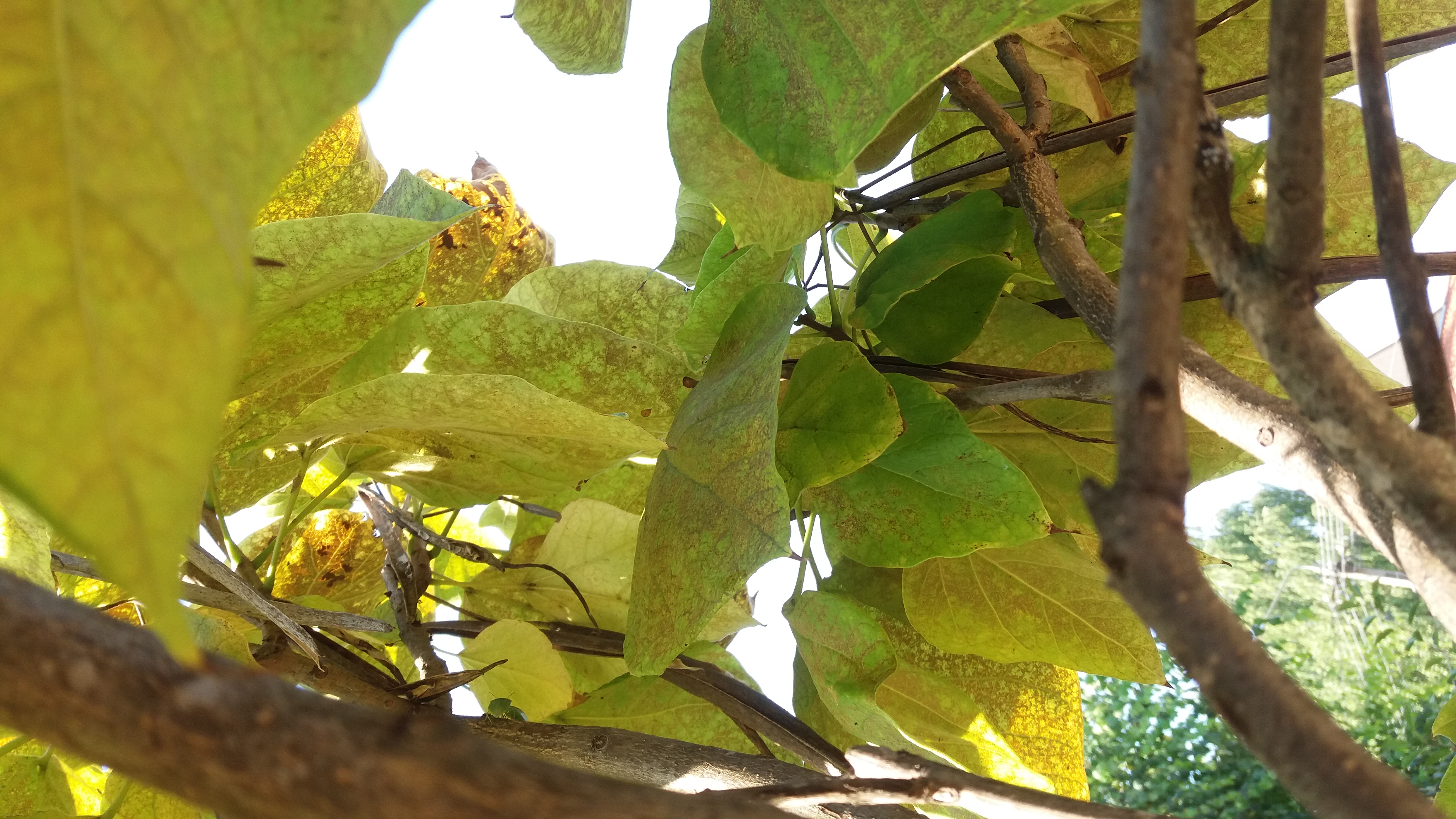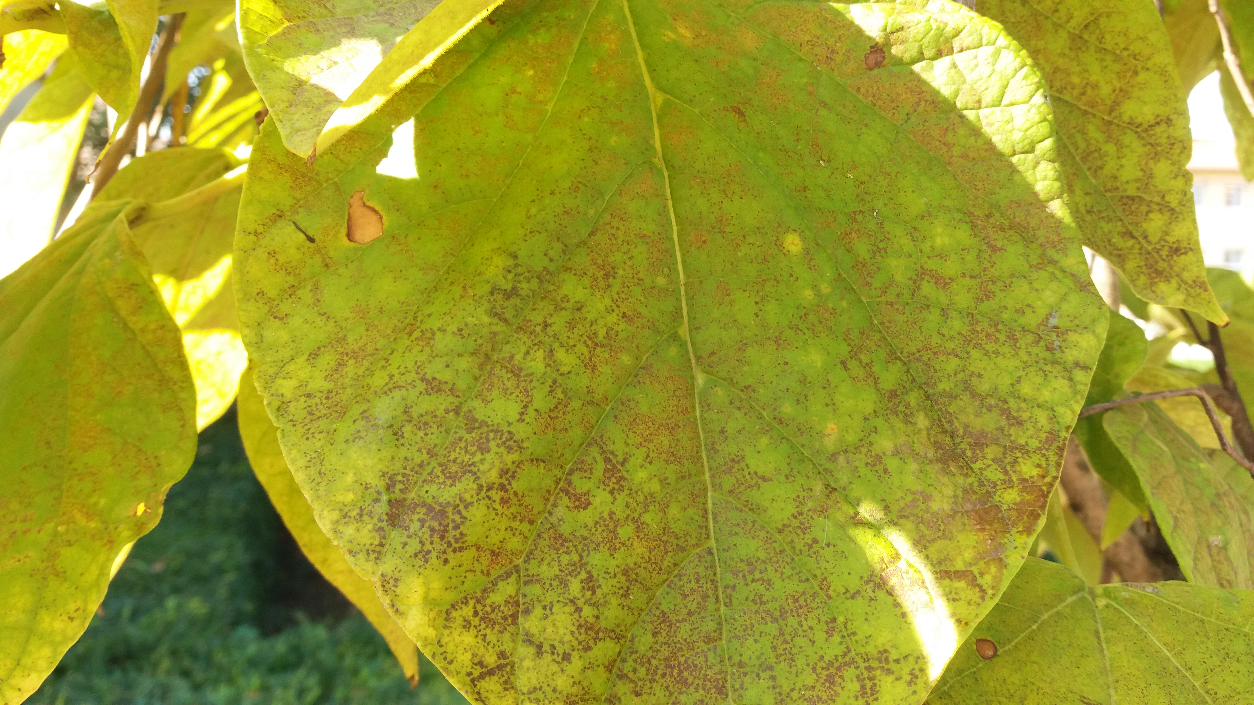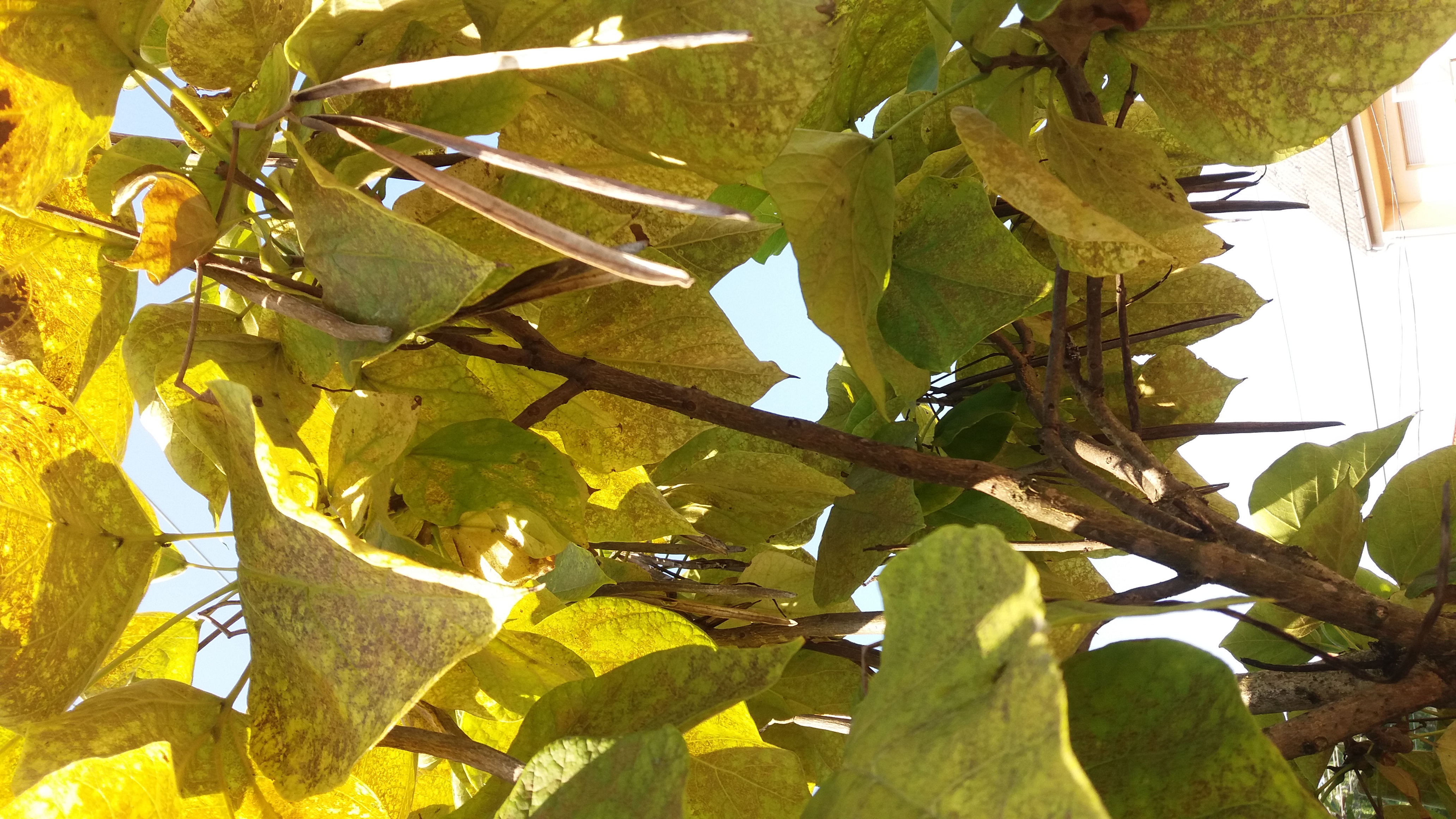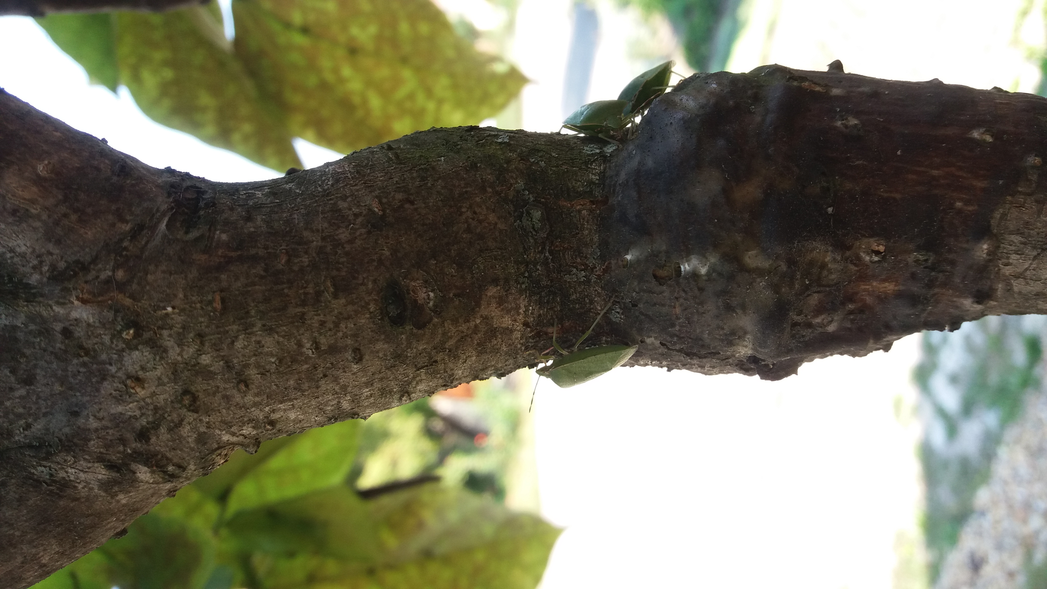 A fàk ttörzse èpnek tűnik, rengeteg zöld bogàr van a törzseken ès az àgakon. Minden levèl el van szineződve ès elèg sok levèl lukacsos. A levelek hàtuljàn fekete pontok vannak.