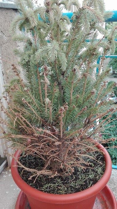 A fenyő nem tűri a tartós cserében nevelést. Tavasz elején ki kell ültetni a kertbe. Alsó, száradó ágait vágják le, a többi még megmenthető.