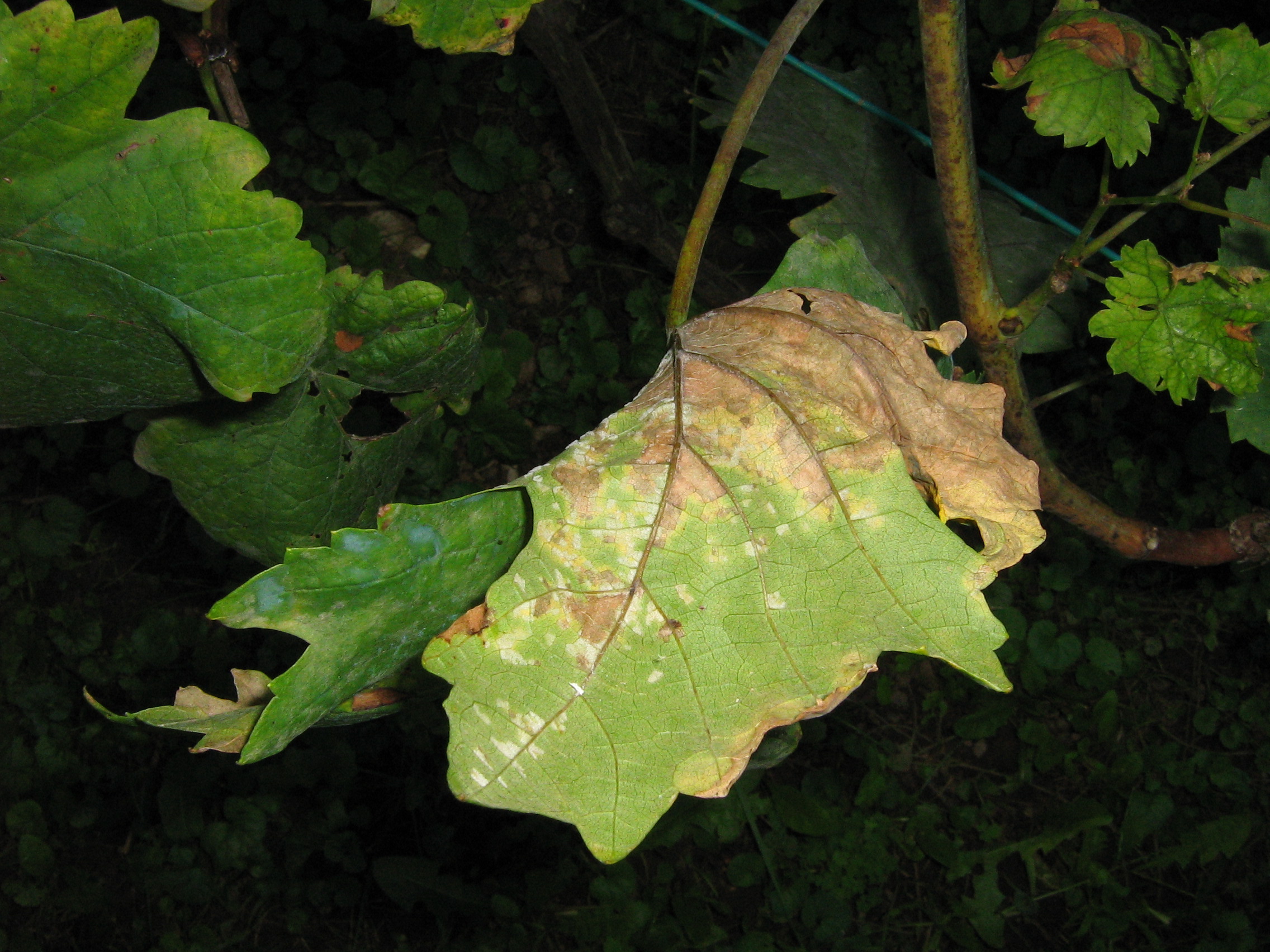 A képen látható levél száradást fedeztem fel a szőlőkön, szeptember elején. Először a kordonos szőlők tetején, később alsóbb részeken is.