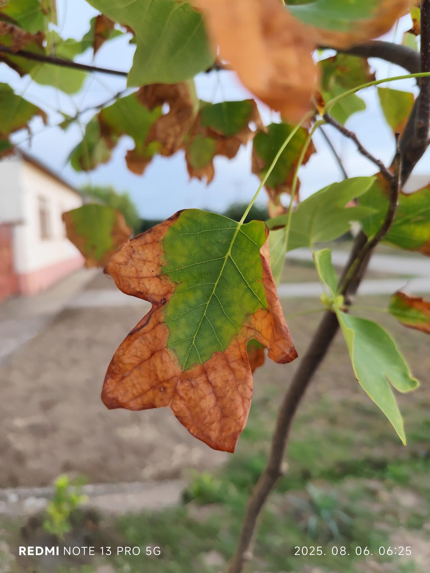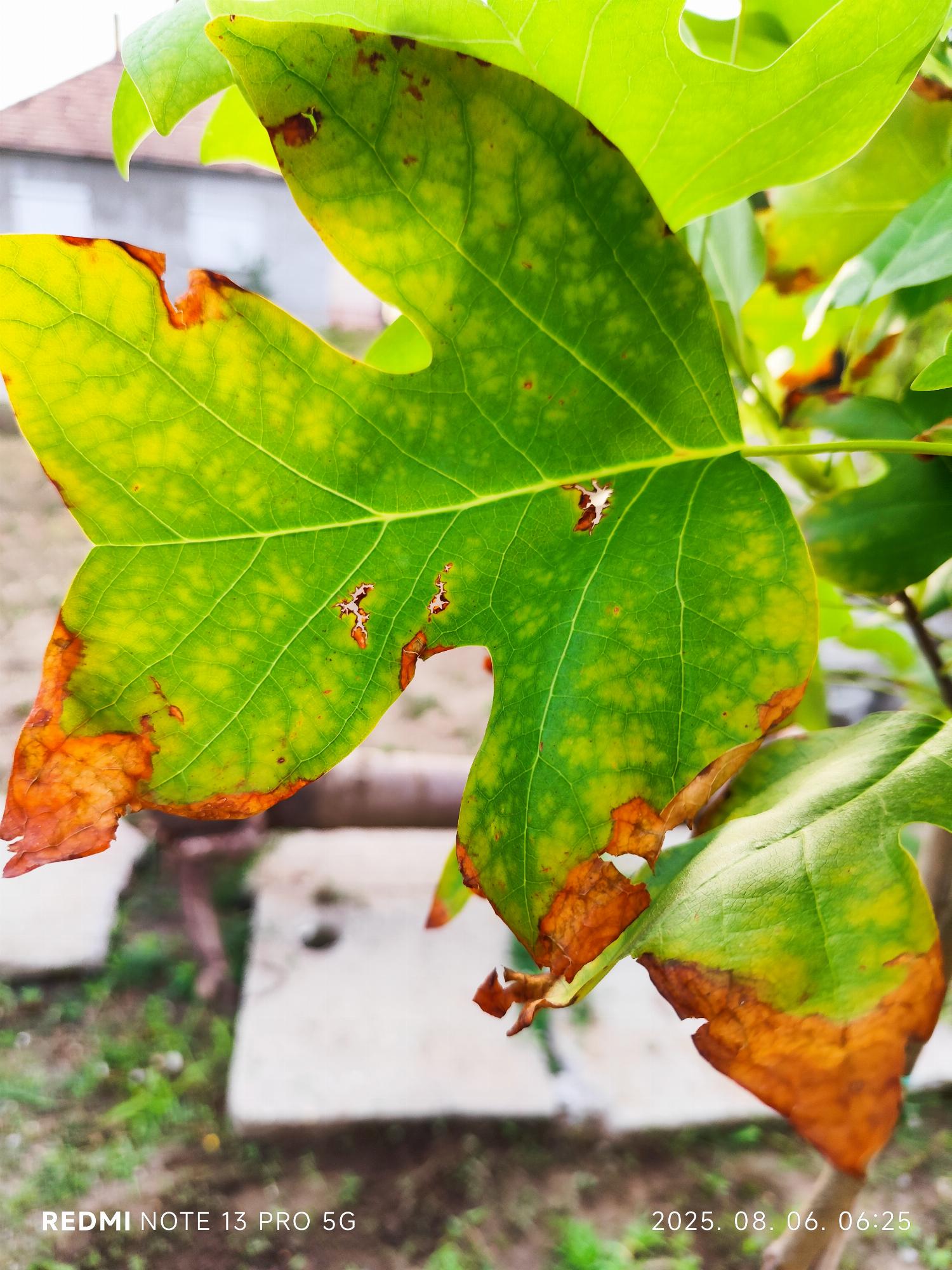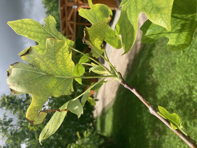 A fa tavasszal szépen befakadt, majd a képen látható módon először elkezdtek barnulni a levelei, majd teljesen el is száradtak. Az új hajtásoknál is ugyanez volt sajnos a folyamat. Ami érdekes volt, hogy a fa levelei foltosodtak és el is vékonyodtak majd emiatt szakadások is keletkeztek benne. Természetesen a fa locsolására odafigyeltem, de a tavasz egyébként is nagyon csapadékos volt. Mára sajnos már csak 1-2 levele van a fának.