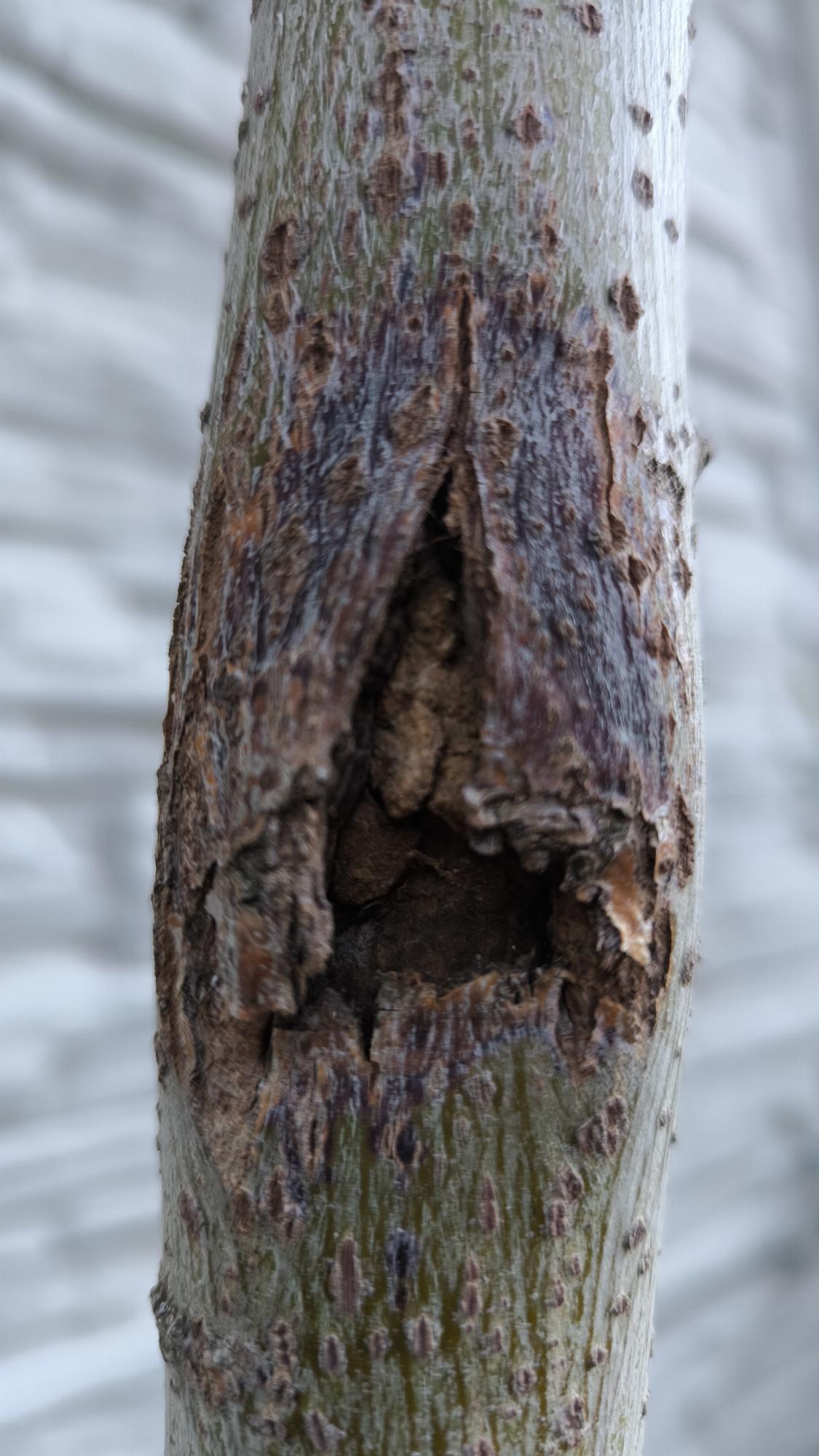 A sebzésen - melyet hajtások kivágásával, az egyenes, magas törzs kialakítása céljából - kórokozó gomba telepedett meg. A fotó alapján két oldalról a sebet kalluszképződéssel próbálja a fa "begyógyítani". Ezt a természetes "öngyógyítást" támogathatná meg egy kis segítséggel A sebet belül és külső részén is fasebkezelővel alaposan kenje be. Kis idő múlva - 2-3 hét - Bordóilével töményen, az előbbivel hasonlóan kezelje. A kezelt területet jól szellőző anyaggal kösse át és a kötést hagyja rajta néhány hétig.