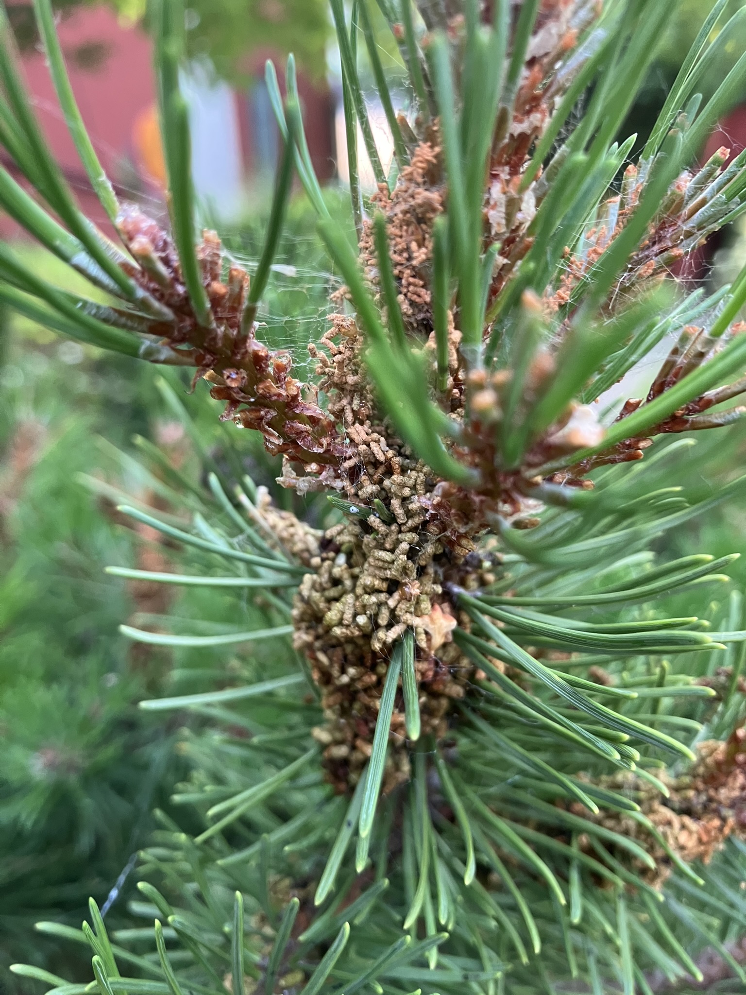 Valamelyik fenyődarázs ürüléke! A rovar lárvája nem látszik, így pontos azonosítás nem lehet! Feltehetően már bebábozódott! Pár hét múlva repül a rovar, akkor permetezhető. Sárga ragacslap segíthet. Figyelni mikor lesznek mozgó lárvák, akkor is permetezni. Mospilan 20SP
