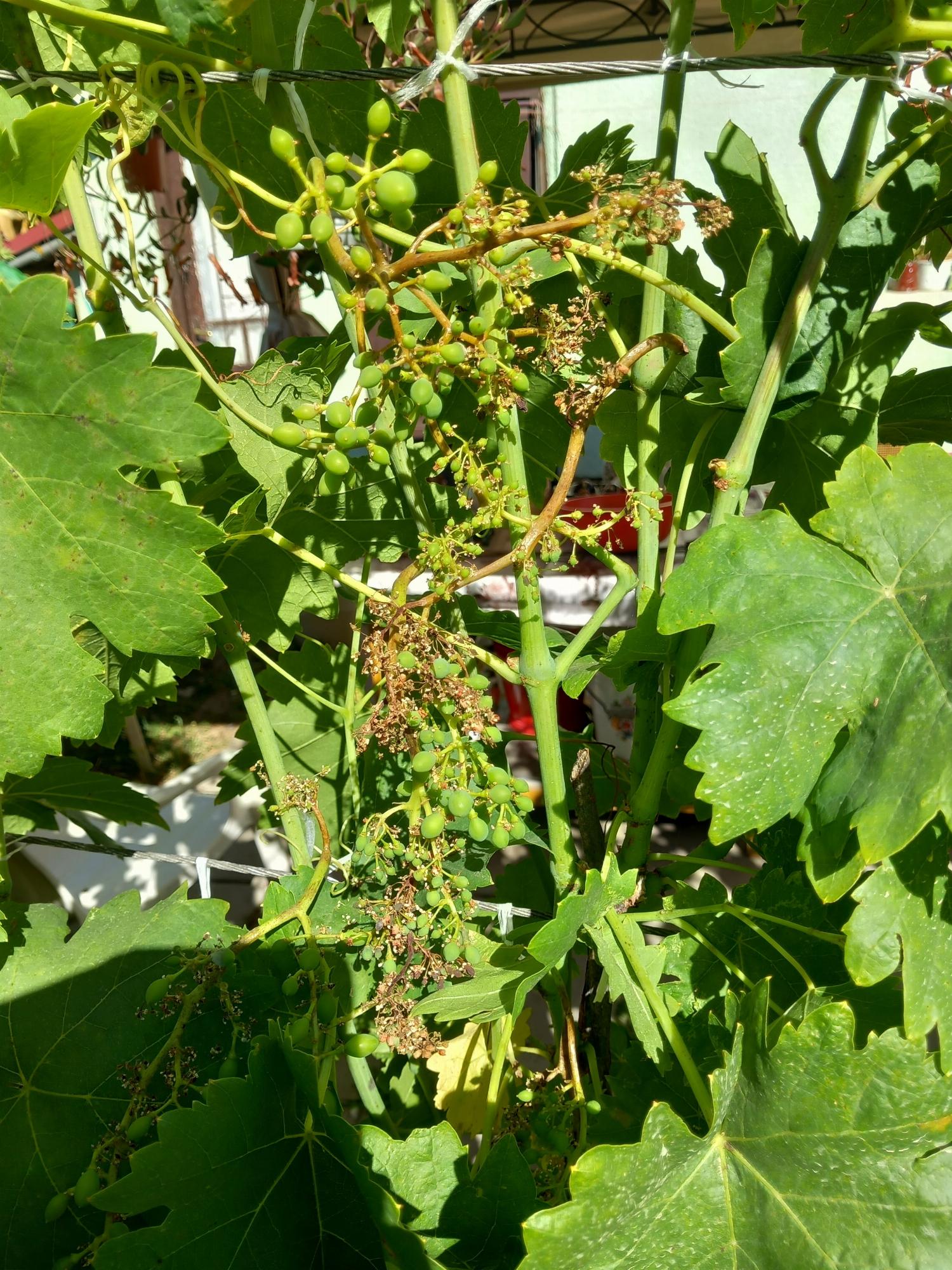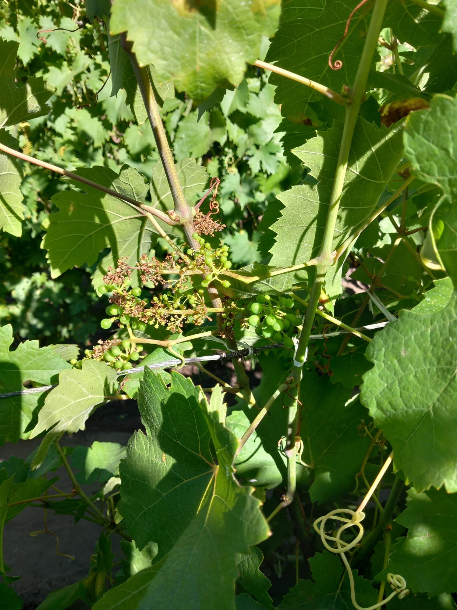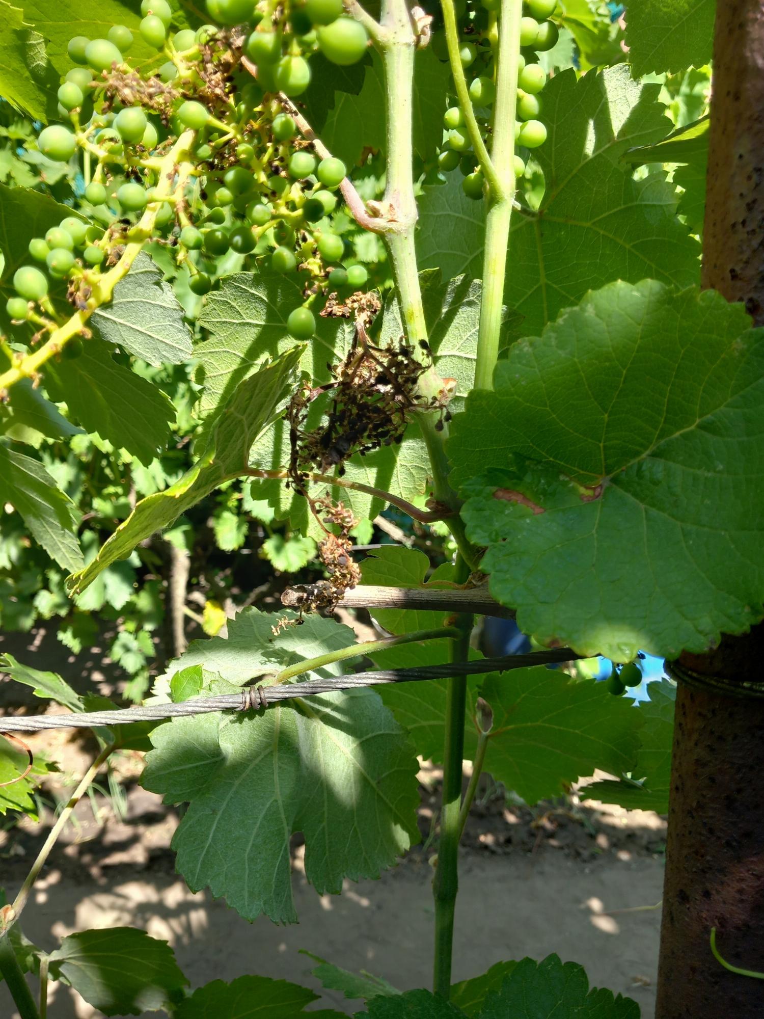 A képen elég sok "madárkás fürt" látható, vagyis a tőke nagy terhelésnek kitett állapotba került. Az aszályos forróság úgyis csökkenti a növény kondícióját és nem képes teljes fürtök kinevelésére. A lisztharmat és a fürtperonoszpóra erős fertőzése is kiválthat hasonló tüneteket, de az Ön esetében a vesszők nem mutatják a lisztharmat tüneteket és a peronoszpóra penészgyepét sem. A fürtvirágzatot a szőlőmolyok is hasonló tünetekkel károsíthatják. Véleményem szerint az Ön esetében a nagy terhelést volna jó megszüntetni, figyelembe véve az időjárás szélsőségeit.