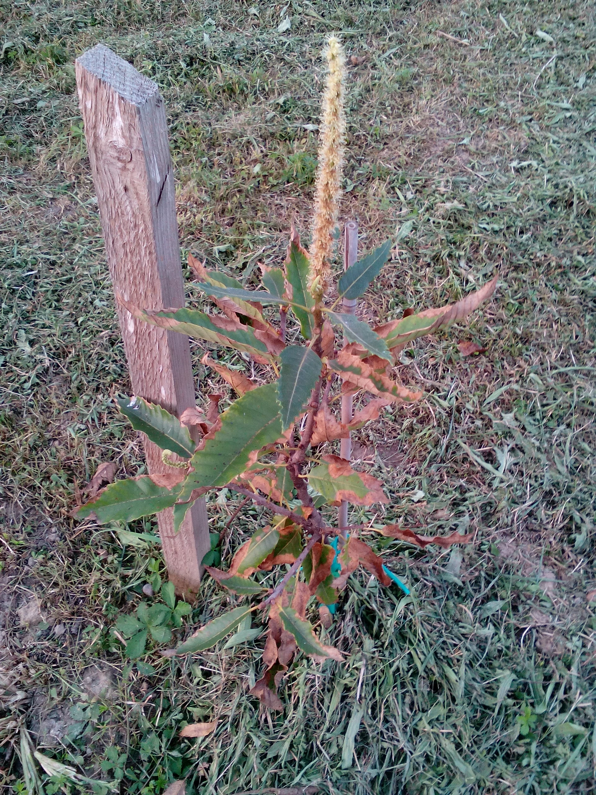 a gesztenye savanyú talajon fejlődik jól. A 6,9 - 7 ph inkább semleges. ez okozhat tápanyag hiányos tüneteket. Ez leginkább kálium. esetleg magnézium hiányra utalnak. A megfelelő kálium, kalcium magnézium arány minden növénynél fontos. Én kénsavas kálium trágyázást javaslok 20- 25 g /m2 mennyiségben a gyökérzónába bedolgozva.